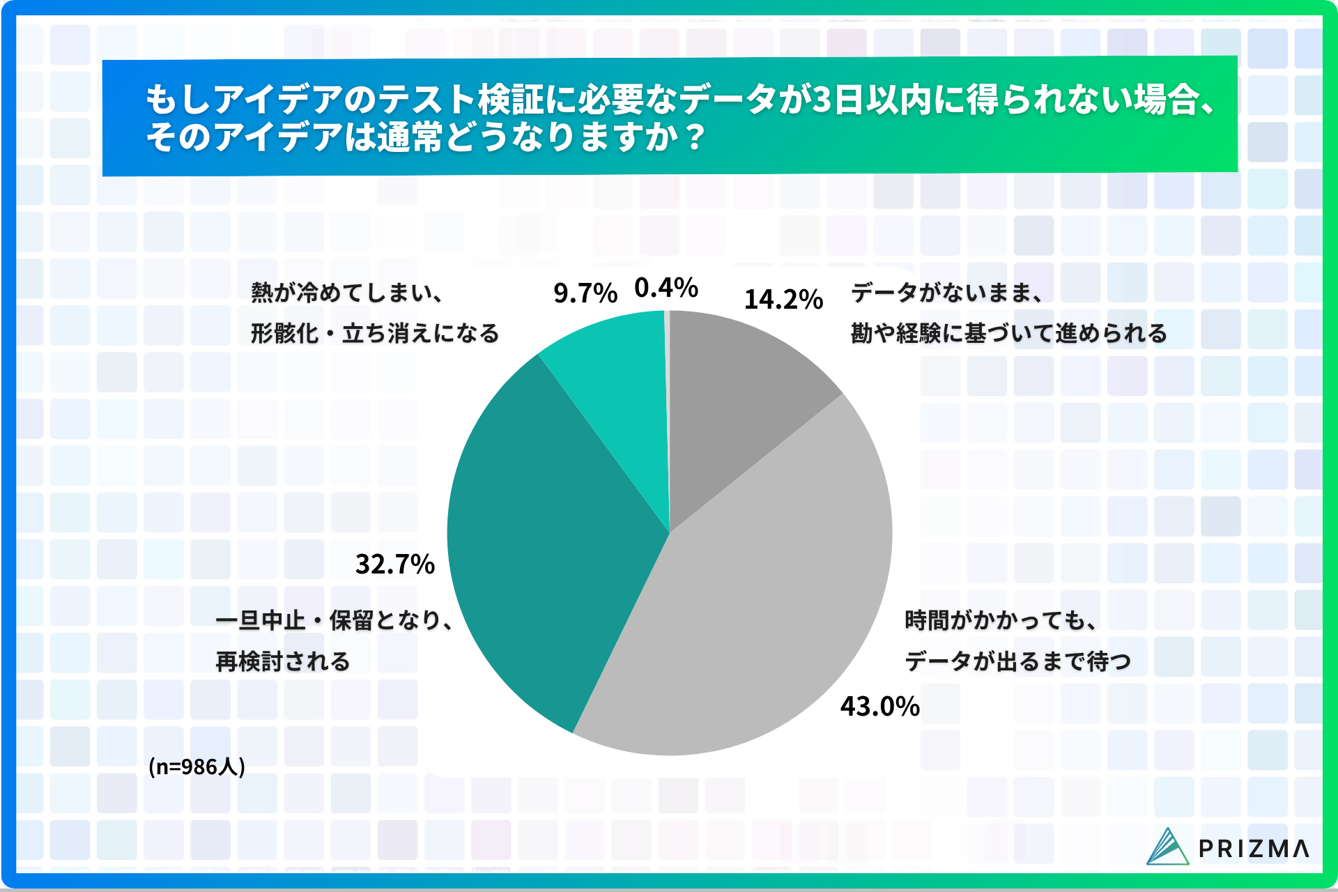 調査によると、必要なデータが3日以内に得られない場合、「一旦中止・保留となり、再検討される(32.7%)」、「熱が冷めてしまい、形骸化・立ち消えになる(9.7%)」と、合わせて約4割ものアイデアが実行されずに消滅に追い込まれる実態が明らかになりました。