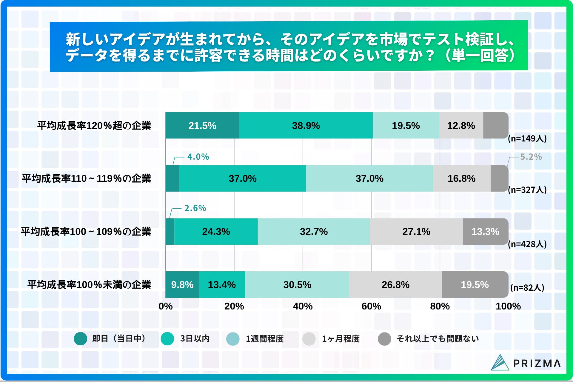 年平均成長率120%超の高成長企業では、約6割がアイデアの検証データを「3日以内」に入手することを求めています(「即日」21.5%、「3日以内」38.9%)。彼らにとって、データ収集は数週間かけるプロジェクトではなく、日常的な業務の一部として組み込まれていることがわかります。
