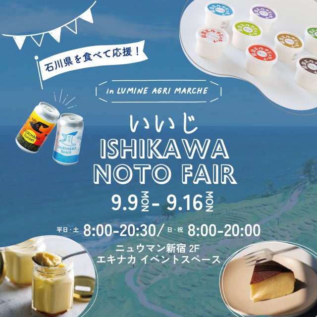 9月9日(月)~16日(月・祝)は、石川・能登の復興支援イベント「いいじ ISHIKAWA・NOTO in LUMINE AGRI MARCHE」。令和6年能登半島地震の影響で、石川県内ではいまだ現地での消費が回復しない中、復興支援を風化させず長く応援し続けるために実施するイベントです。「食べて応援」の枠を飛び越え、人と人の心のつながりを目指します。