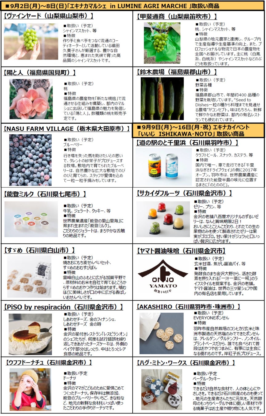9月2日(月)~8日(日)「エキナカマルシェ in LUMINE AGRI MARCHE 」取扱い商品