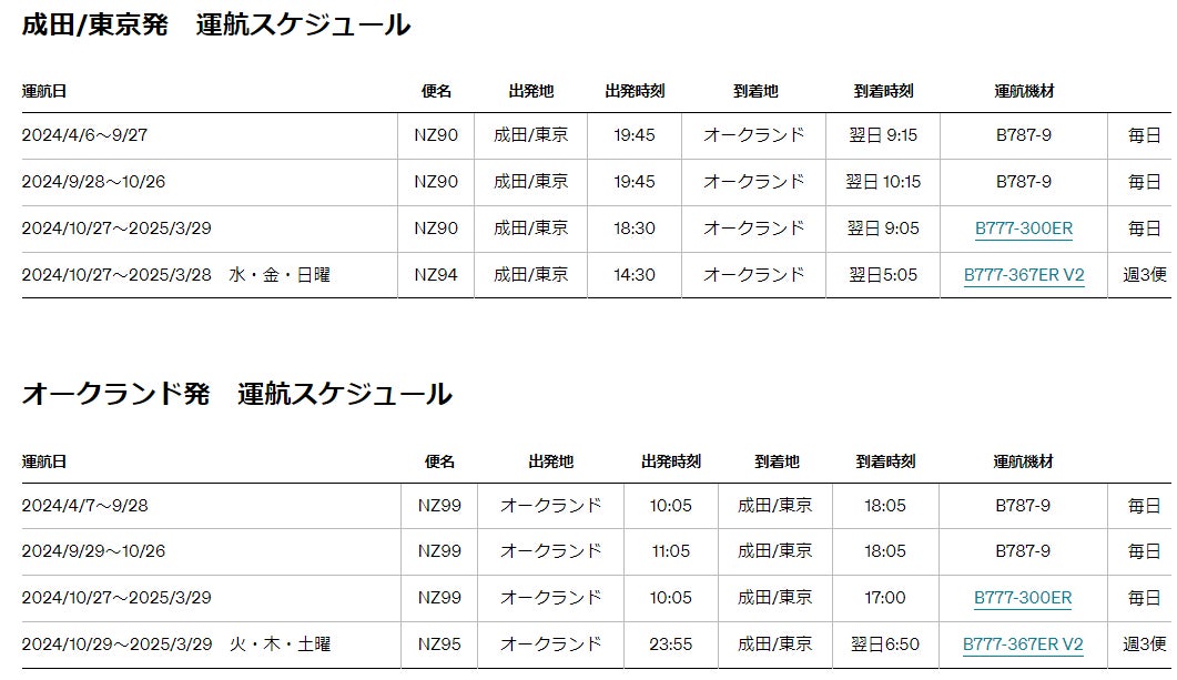 成田-オークランド間は現在、ボーイング787-9型機にて毎日1便運航しています。冬期スケジュールでは週3便増便し、ボーイング777-300ER型機およびボーイング777-367ER型機を投入し、週10便で運航します。