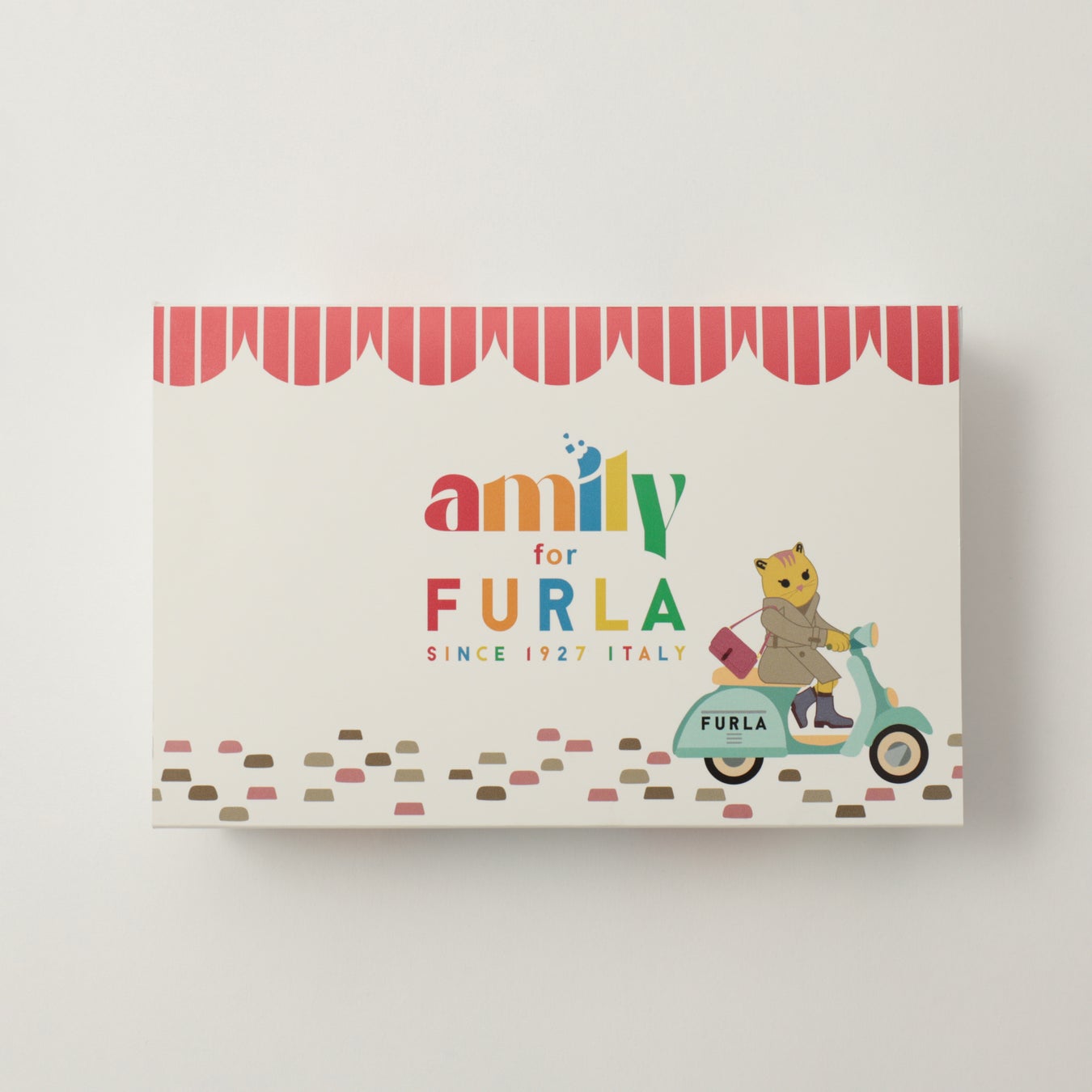 11月21日(金)より、全国のフルラ直営店にて44,000円(税込)以上のお買い上げで、「AMILY x FURLA」のスペシャルコラボデザインボックスに、AMILYのチアフルチョコチップ生クッキー2枚、フルラオリジナルステッカー2枚をセットにしてプレゼントいたします。