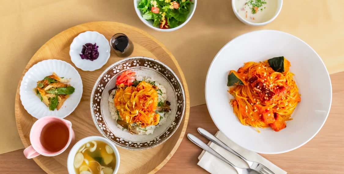 9月5日(火)より、ゆとりの空間カフェ・レストランにて、「きのこごはんとエビのかき揚げ丼」、「厚切りベーコンと栗かぼちゃのトマトクリームパスタ」をはじめ、秋季限定ランチメニューやデザートが登場!
