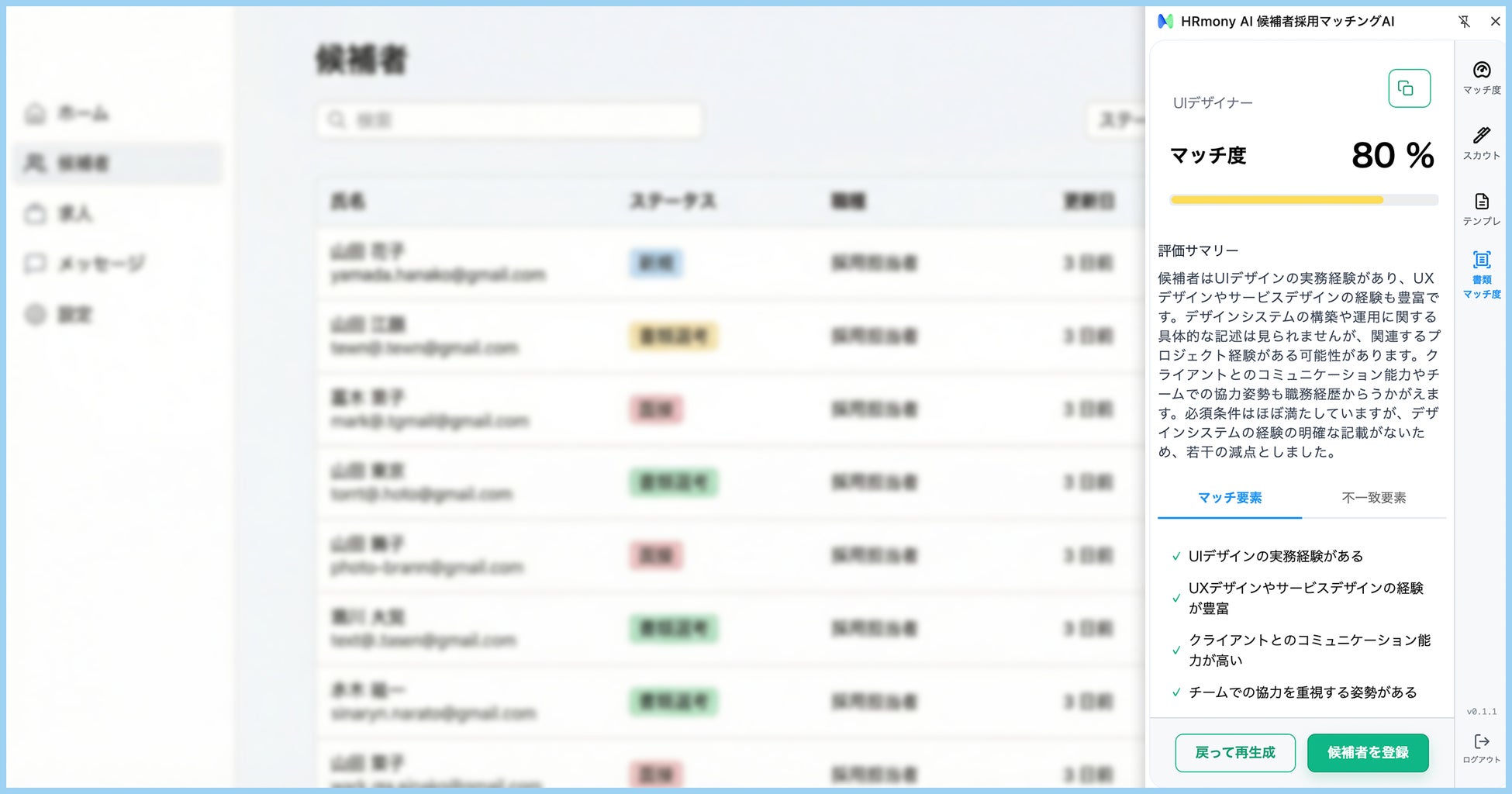 各種採用管理ツール(ATS)の画面を開いた状態で、HRmony AIのブラウザ拡張機能を使用することで、書類選考をAIで自動化する機能です。ATSの画面上で直接HRmony AIの書類選考機能を利用でき、データ移行の手間を減らすことが可能になります。また候補者の履歴書・職務経歴書をワンクリックで解析し、採用要件とのマッチ度を算出します。