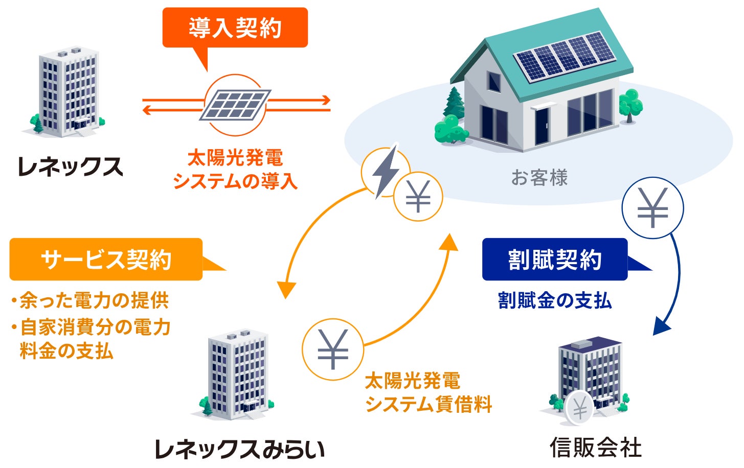 ソーラーメイトみらいの「固定単価こつこつプラン」は、お客様にて購入・設置される太陽光発電システムを、設置後、住宅用PPA事業を推進する「レネックスみらい合同会社」(以下、レネックスみらい)がお借りし、発電した電力を含め管理運営いたします。太陽光発電システムをお客様より借り受ける期間において、システム貸借料をレネックスみらいからお客様にお支払いすることで、お客様は太陽光発電システムの購入・設置にかかる割賦相当金額をまかなうことが可能となり、購入・設置時の費用のご負担が「実質0円※」となるサービスです。
