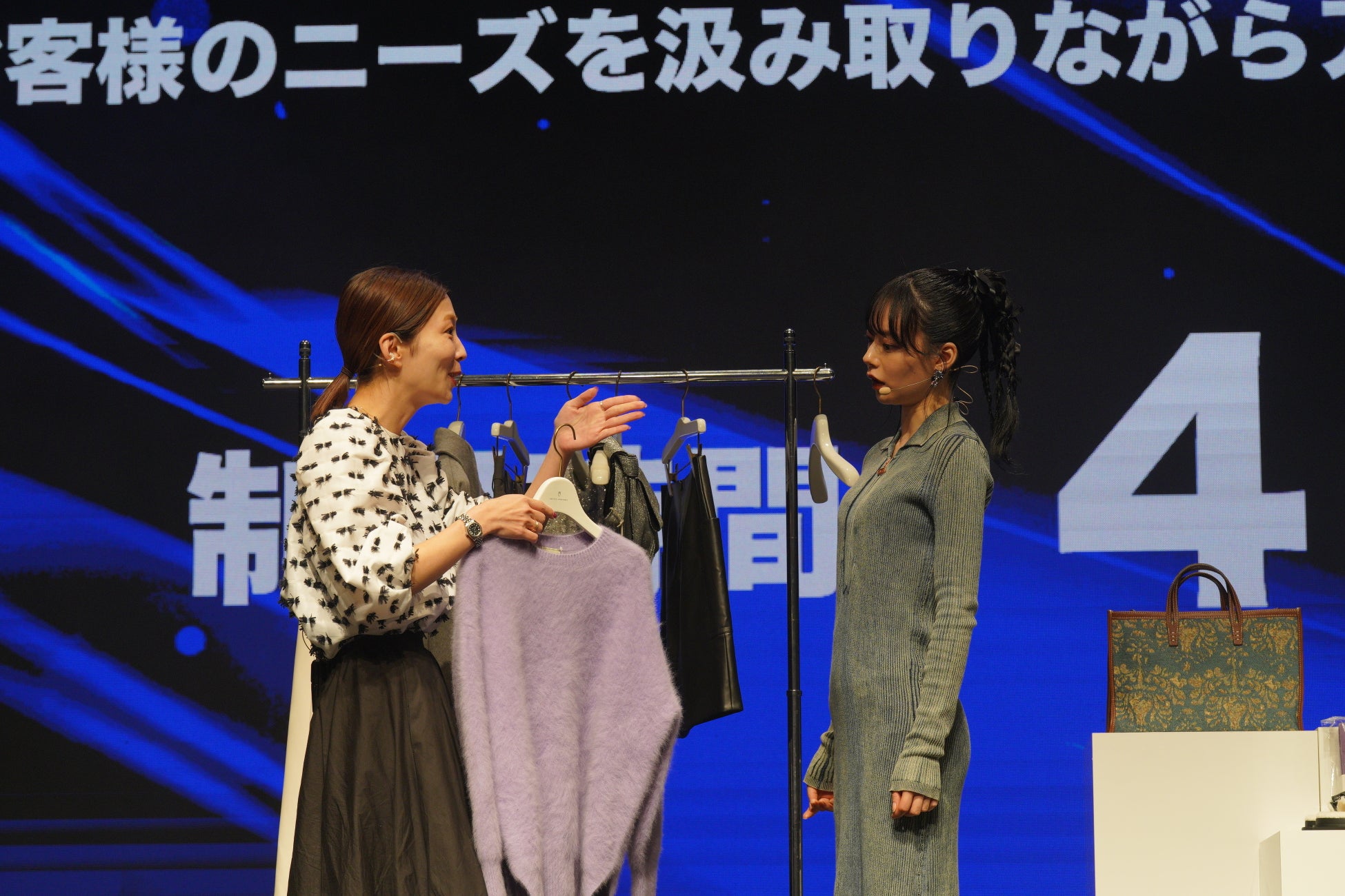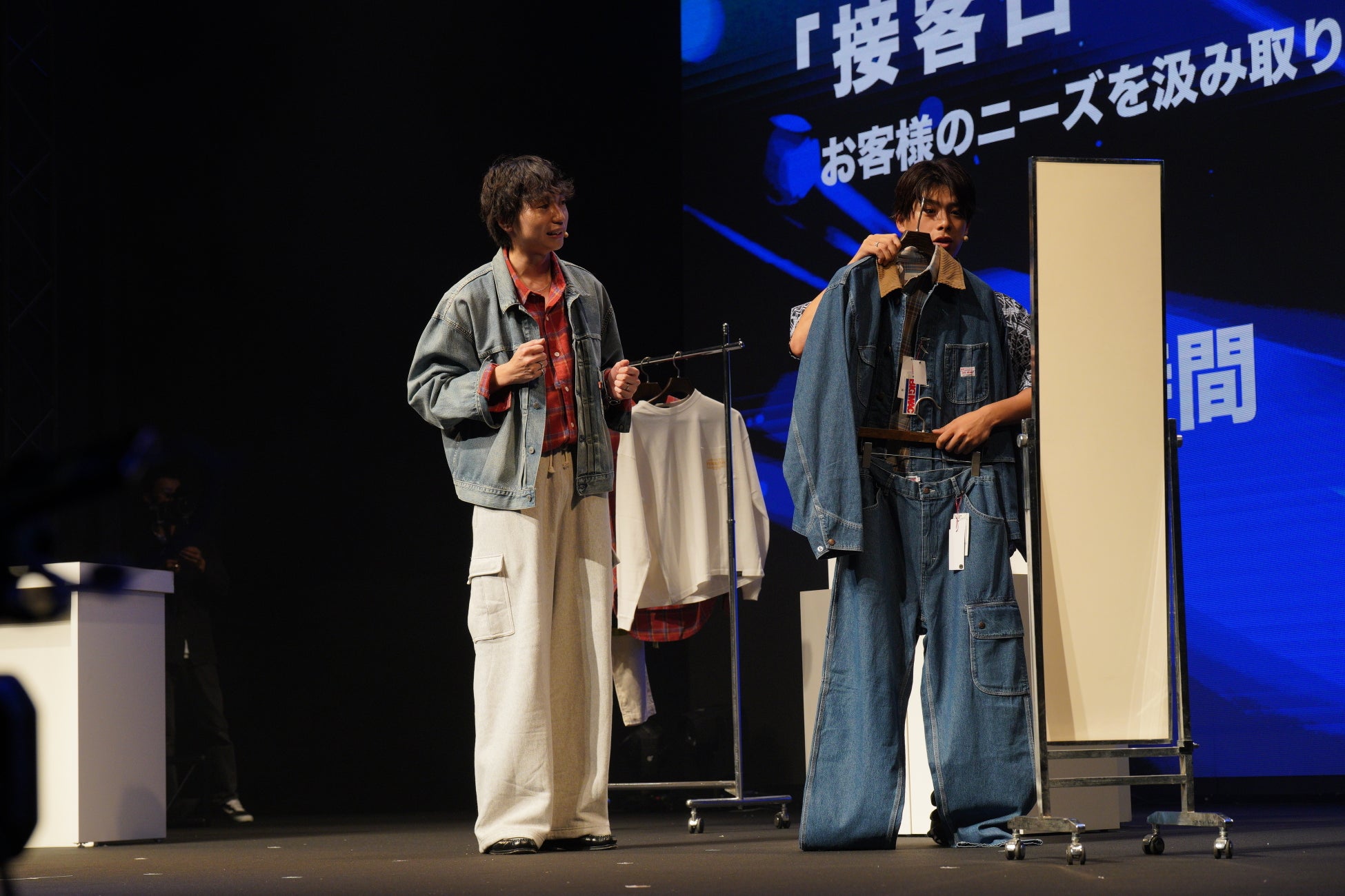 “接客ロールプレイング”では、お客様に扮したゲストの村重杏奈さん、なこなこカップルさん、お笑い芸人スパイクさん、ユージさんが登場。「恋人との記念日ディナー」や「おしゃれな友人の誕生日パーティー」「デイキャンプ女子会」など、様々なシーンを想定した洋服のリクエストに、ファイナリスト16名はそれぞれのブランドのファッションアイテムからコーディネート力や汲み取り力、提案力を生かし接客を行いました。