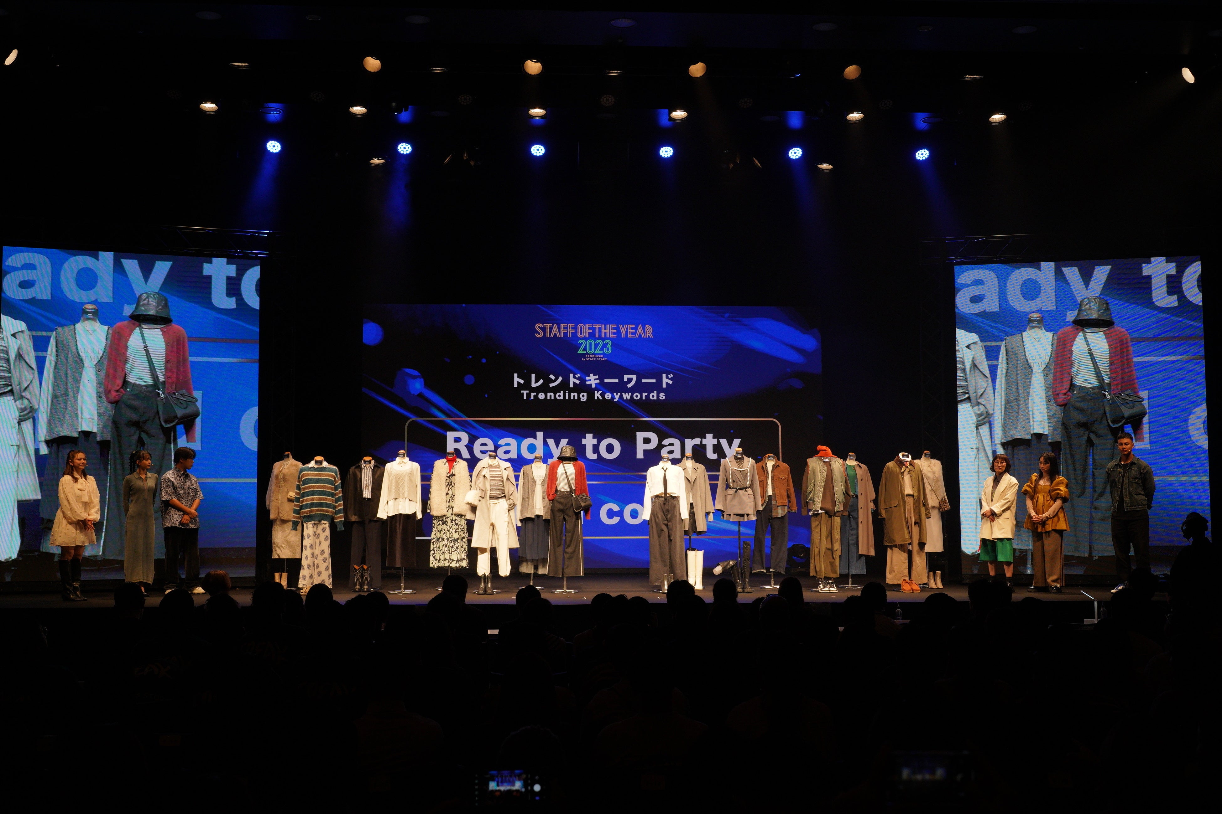 今年は初の試みとして、ファイナリスト16名がそれぞれ1パターンずつ考案したトレンドコーディネートをお披露目。こちらのコーディネートを元に、STAFF OF THE YEAR 2023の今季トレンドキーワードを発表しました。