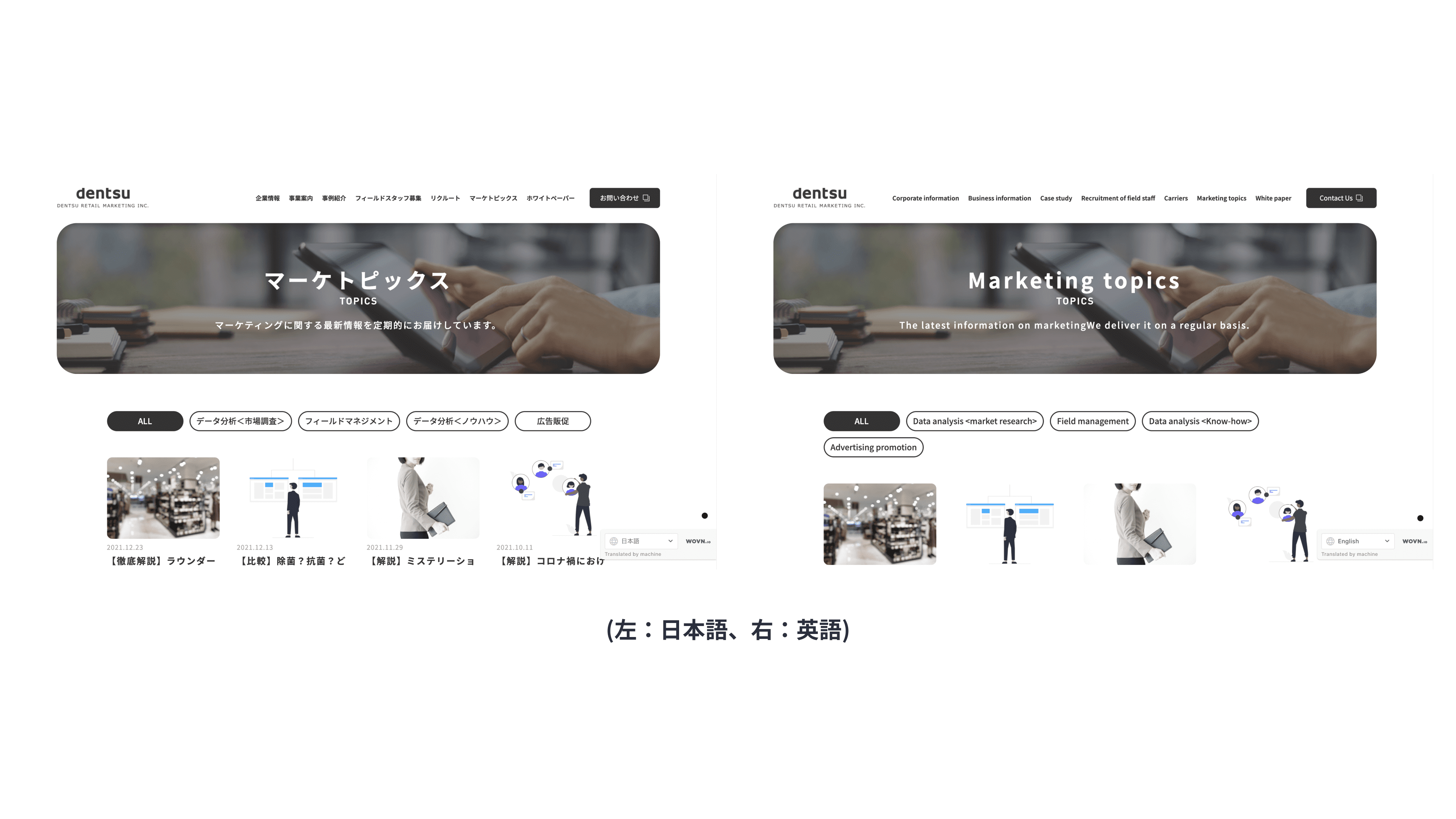 電通リテールマーケティングのコーポレートサイトに WOVN.io を導入し英語で表示しております。中でも「マーケトピックス」や「ホワイトペーパー」ページを英語で閲覧いただき、サービスに関する理解を深めていただくことを実現します。
