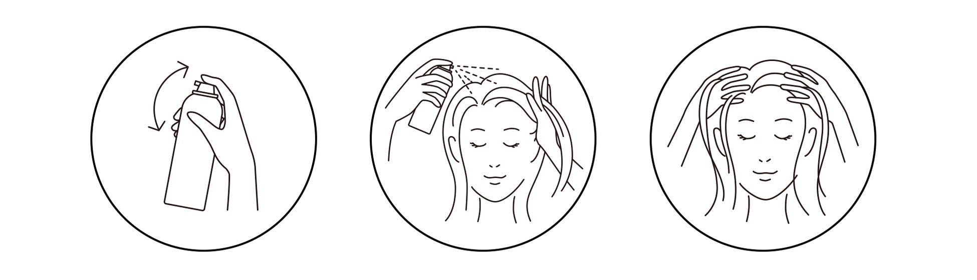STEP 2. 15〜20cmはなし、 髪を小分けにしながら頭皮、髪の根元に向かって適量をスプレーします。