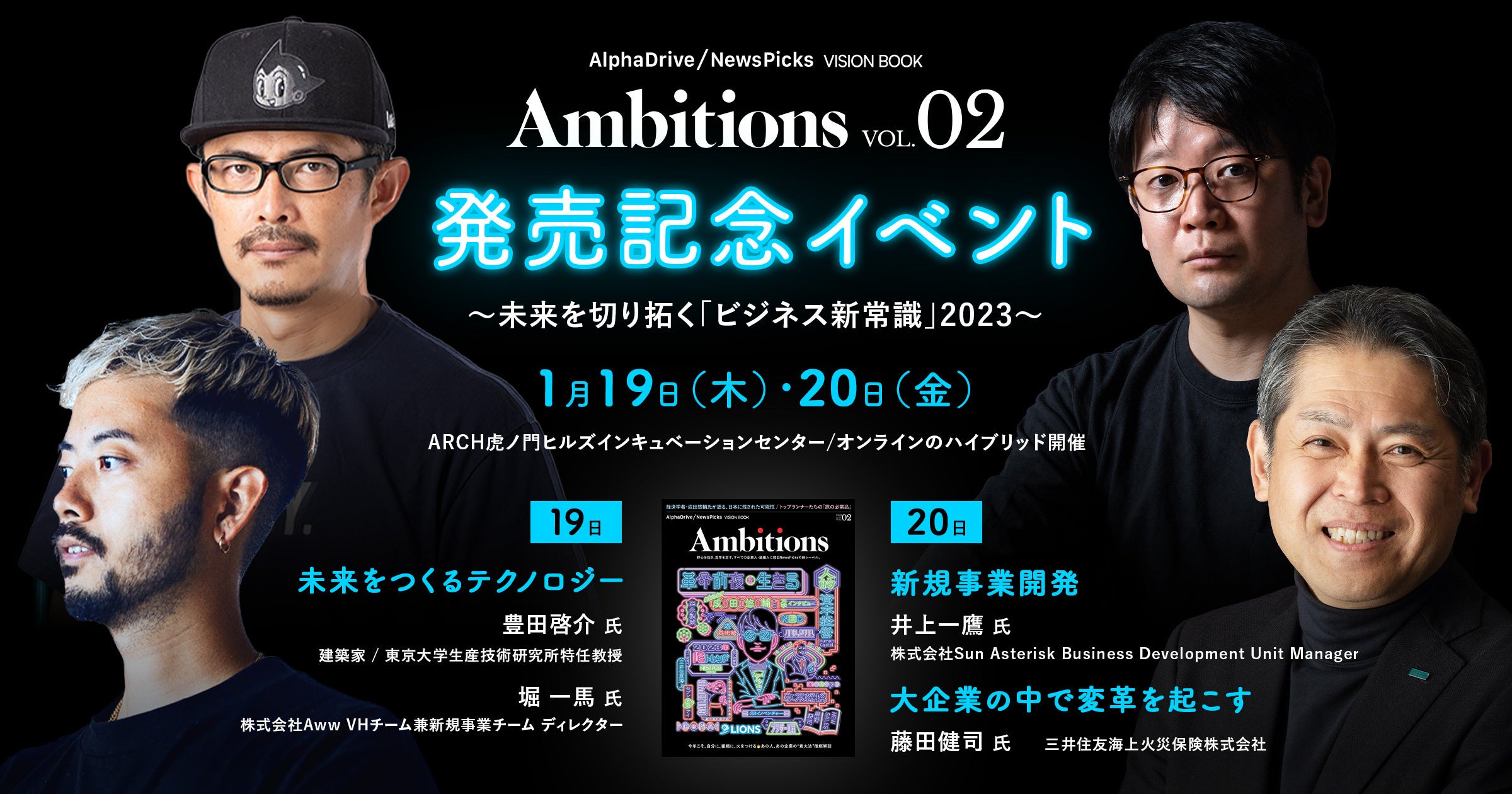 株式会社ニューズピックス(以下、NewsPicks)は、株式会社アルファドライブ(以下、AlphaDrive)との共同事業であるAlphaDrive/NewsPicksのVISION BOOK、『AlphaDrive/NewsPicks VISION BOOK Ambitions Vol.2』を1月20日(金)に発売します。また、発売記念イベントを1/19(木)・20(金)の2日間、ARCH虎ノ門ヒルズインキュベーションセンターとの共催で実施いたします。
