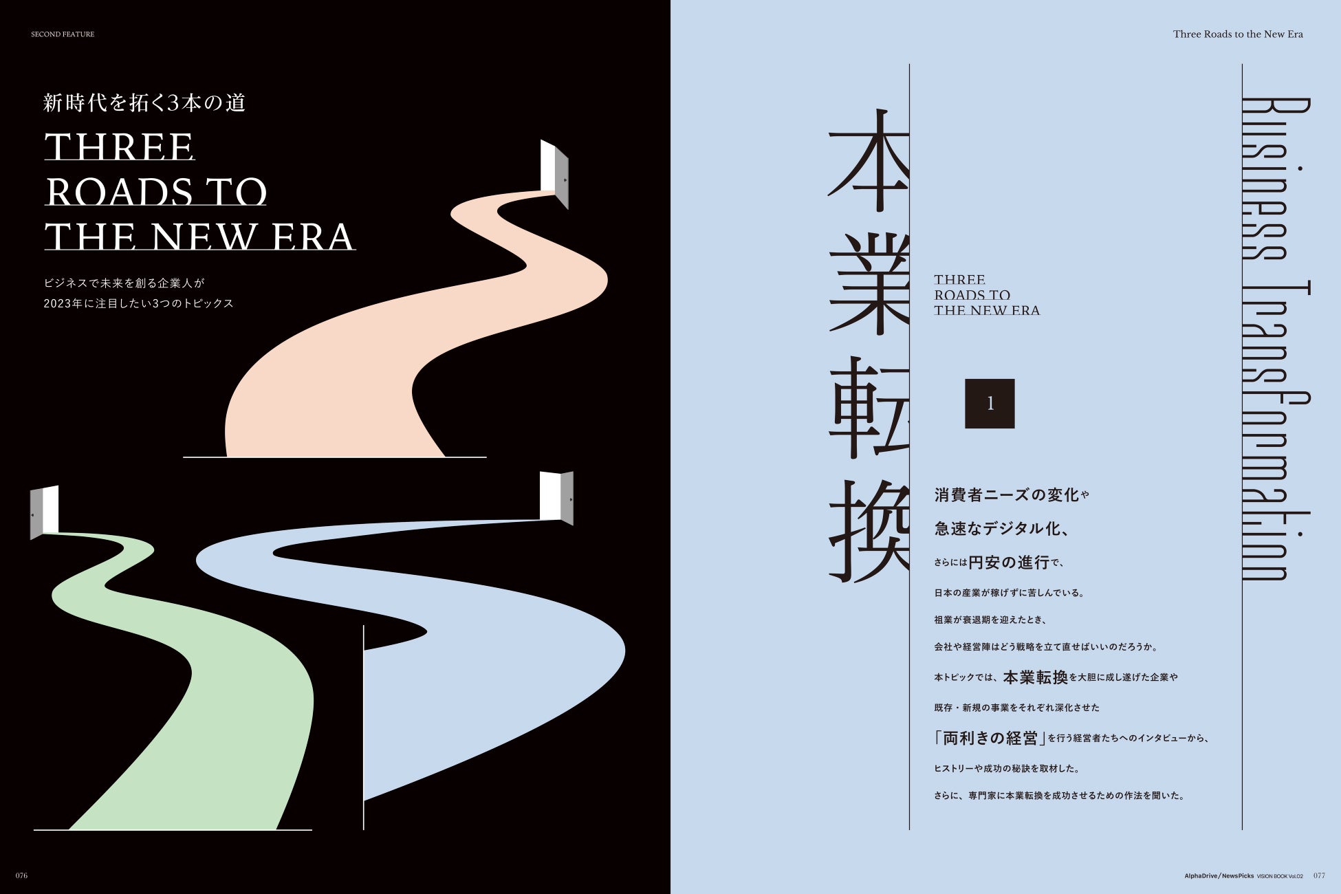 第二特集は「THREE ROADS TO THE NEW ERA」。ビジネスで未来を創る企業人が2023年に注目したい3つのトピックスとして「本業転換」「人的資本経営」「新しい営業」について、実践者や専門家たちが解説する