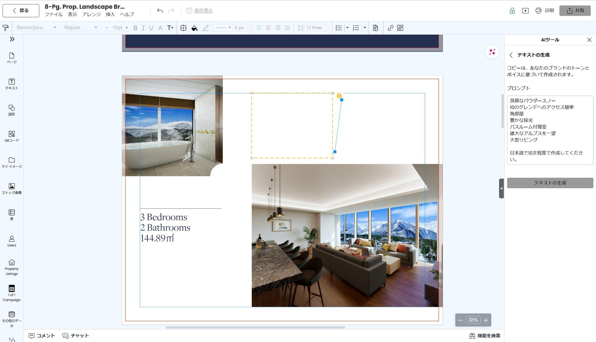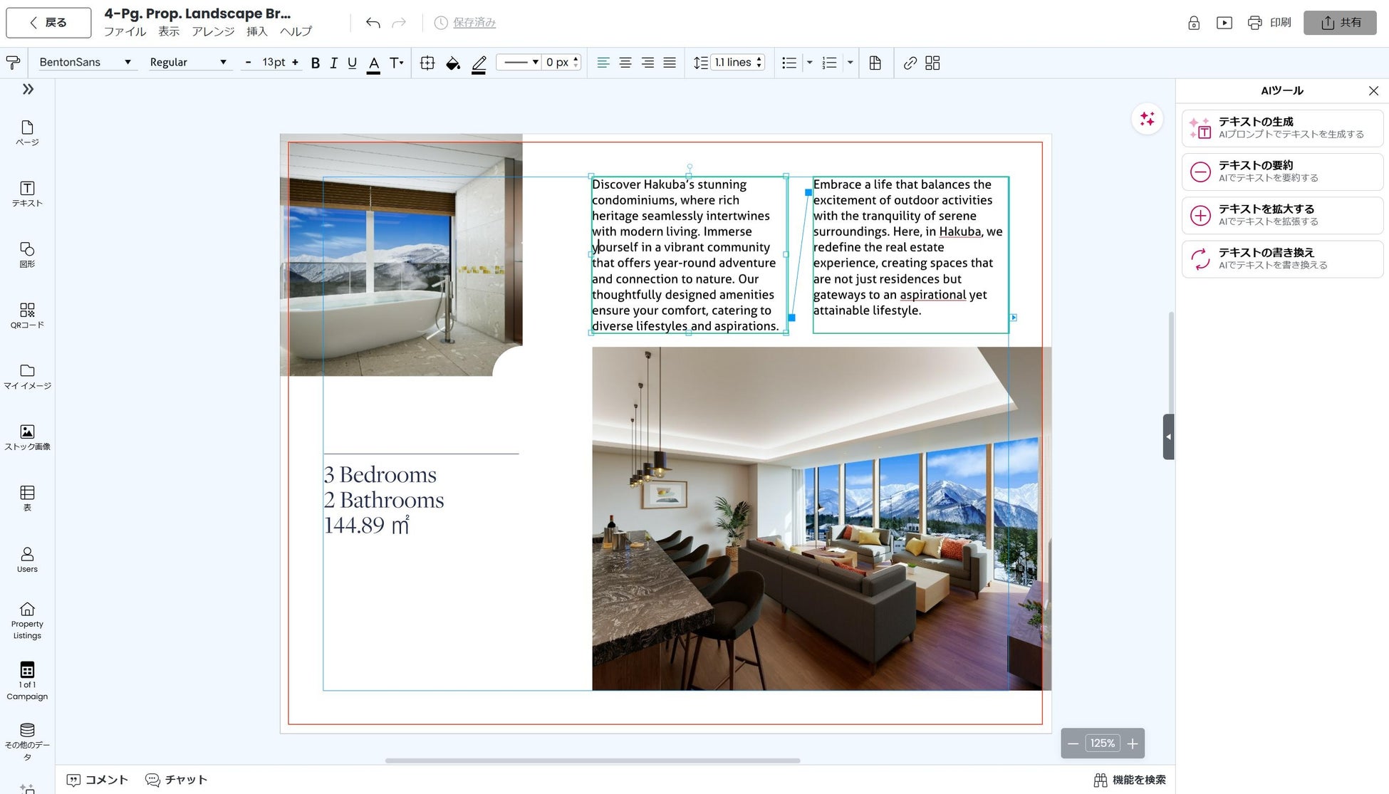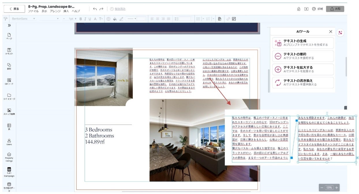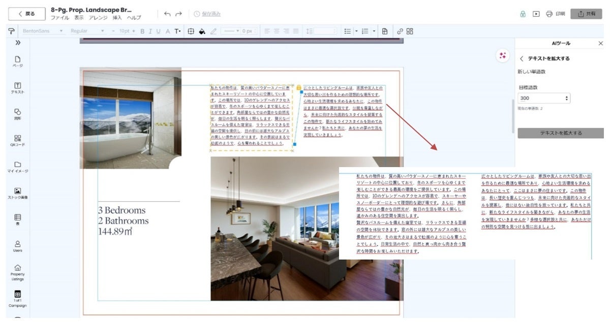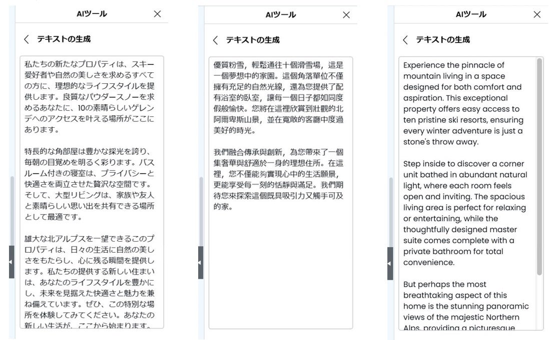 本ツールは、LSIRが国内独占営業権を取得しているサザビーズ インターナショナル リアルティ®(SIR)が加盟店向けに提供しています。物件情報はSIRが運用する不動産ポータルサイト(https://www.sothebysrealty.com/ )と紐づいており、物件を選択すると自動でテンプレートに基本的な物件写真や物件情報が入力されます。さらに文字入力エリアを選択すると、AIツール選択画面が出現し、①物件紹介文の生成 ②文章の要約 ③文章量の増加 ④文章の書き換え が可能です。