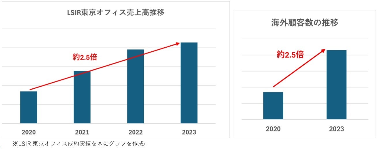 LSIR東京オフィスの売上高推移、海外顧客数の推移共に2020年と2023年を比較すると約2.5倍に増加。