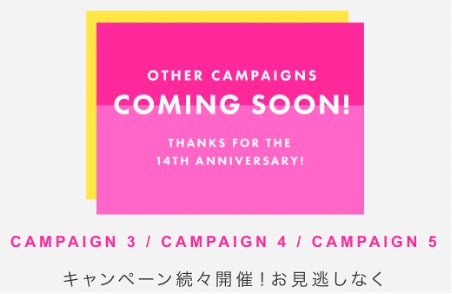 キャンペーンの注目企画は14周年にちなんだ「14円で買えるショッピングクーポン」プレゼント。キャンペーン期間中すべての応募方法で、毎週100名、合計300名に「14円で買えるショッピングクーポン」が当たります。