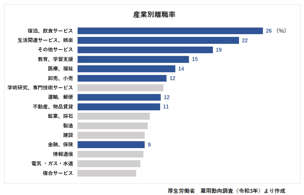 ▲青色が広義のサービス業に該当。離職や入職率が高いとノウハウが蓄積せずコストや育成負担が増える