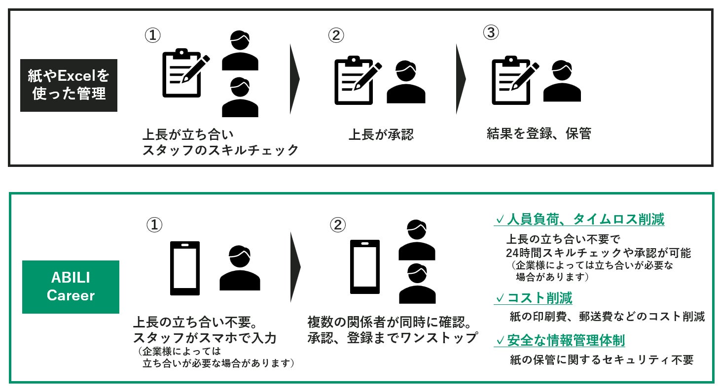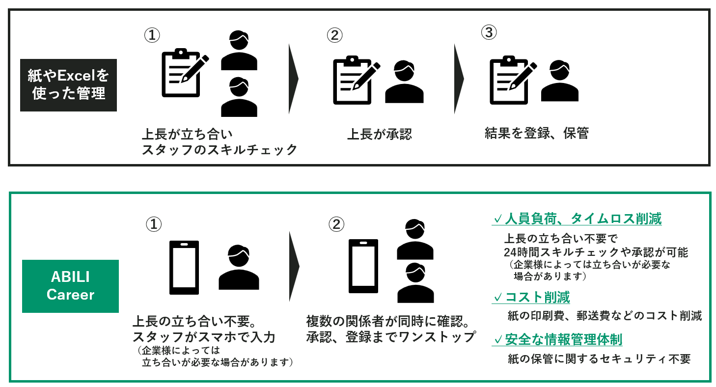 ABILI Careerは現場従業員のスキルを定量的に可視化することができます。従来の紙やExcelベースの管理体制に代わり、デジタル化された効率的なプロセスを提供します。特に、店長を始めとした管理職の運用負荷を大幅に軽減します。