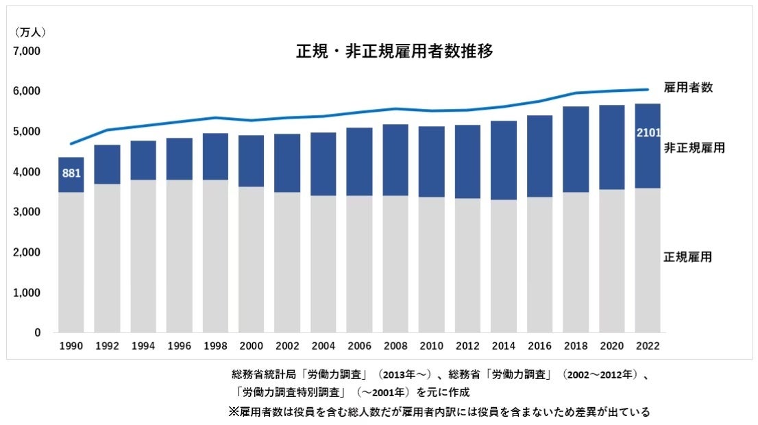 非正規社員は、サービス業を中心とした労働市場において重要な位置を占めるようになり、企業経営において不可欠な要素となっています。企業側は、繁忙期と閑散期の労働力差を埋め、柔軟な人員配置を可能にするため、非正規社員を積極的に活用しています。企業側、労働者側双方のニーズが合致した仕組みとして広く利用され、過去30年間で大幅な雇用者の増加につながったのです。