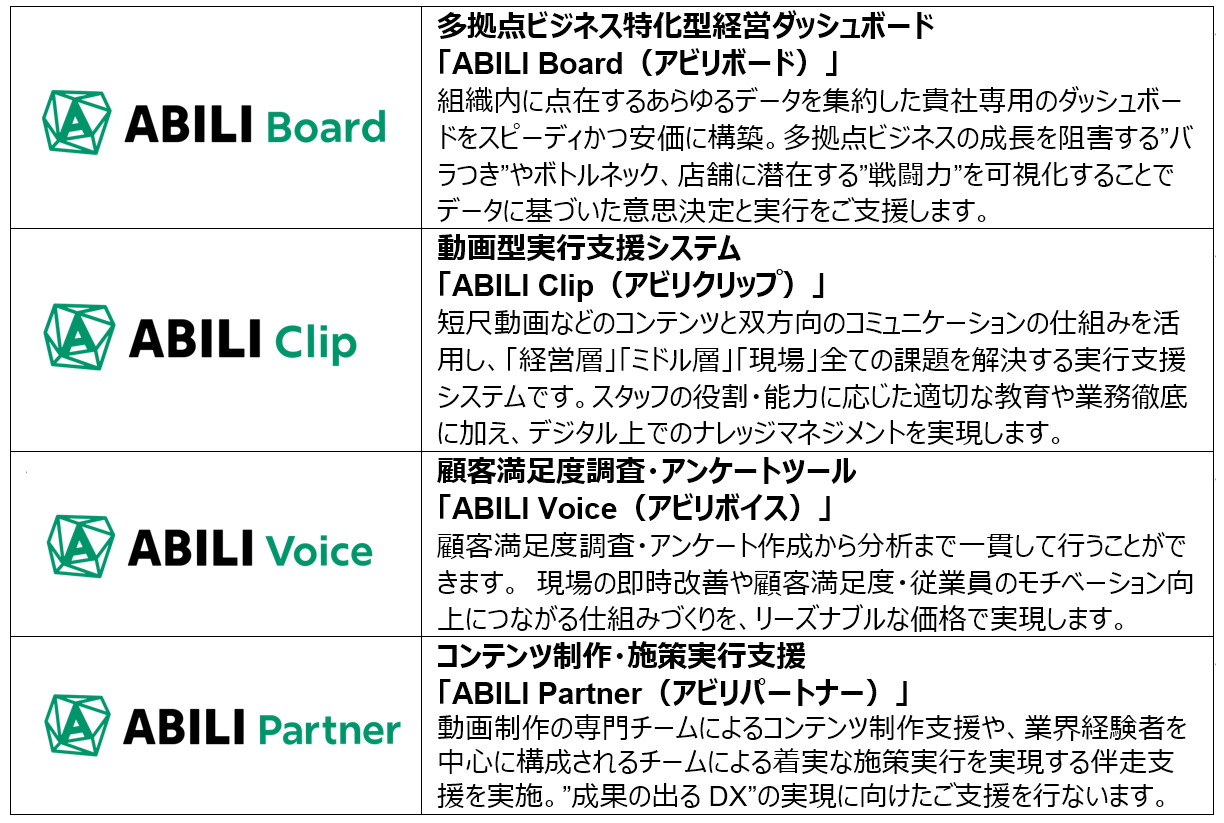 「『できる』をふやす」をミッションに掲げ、2014年の「ClipLine(現ABILI Clip)」リリースにより、GDP の約7割を占めるサービス産業を始めとした多拠点ビジネスの労働生産性向上を支援してまいりました。外食や小売企業の導入から始まり、介護、運輸など様々な生活サービス領域で売上向上、離職率削減、教育時間短縮などの成果を創出してきました。2023年9月にはClipLineのサポート範囲を大幅に拡大し、顧客の課題に徹底的に寄り添った総合的なプラットフォーム「ABILI」を新ブランドとしてリリースしました。