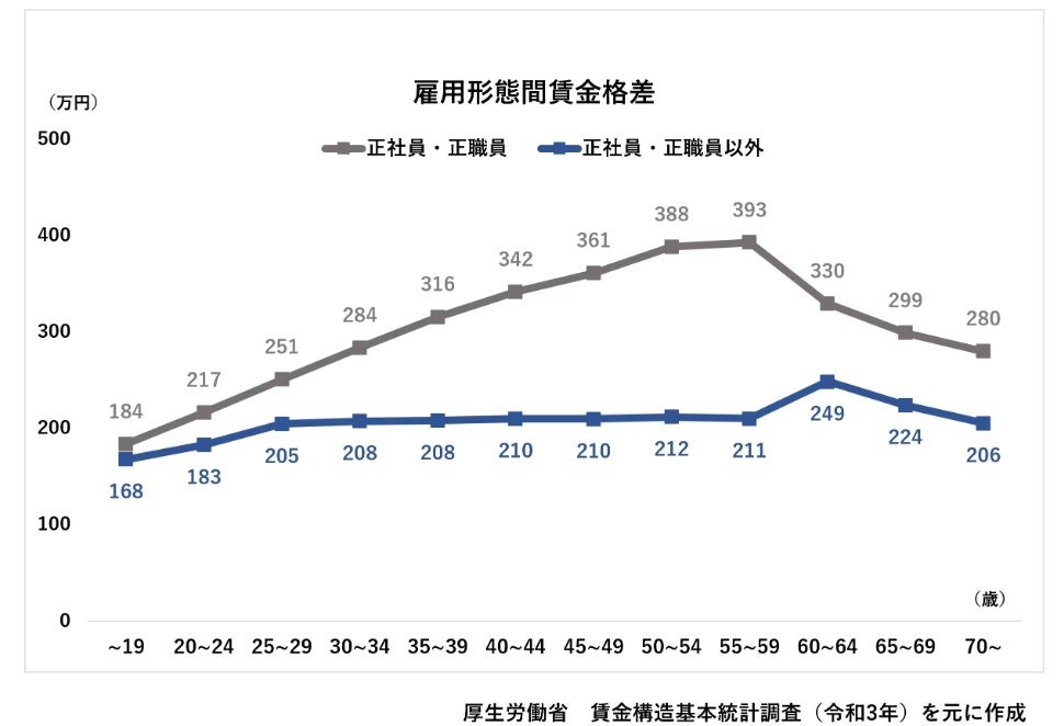 特にコロナ禍においては、多くの非正規社員がエッセンシャルワーカーとして重要な役割を果たしていることが再認識されました。彼らは社会インフラの一翼を担い、その数は総労働力の約4割にも上る2,000万人に及んでいます。非正規社員の給与は、長期間就労していても時給1,000円前後にとどまり、正社員と大差ない仕事をしているにもかかわらず給与格差は大きく、年齢を重ねても給与が上がらないという構造的な問題を抱えています。この現状は、労働市場における格差の問題を浮き彫りにしています。