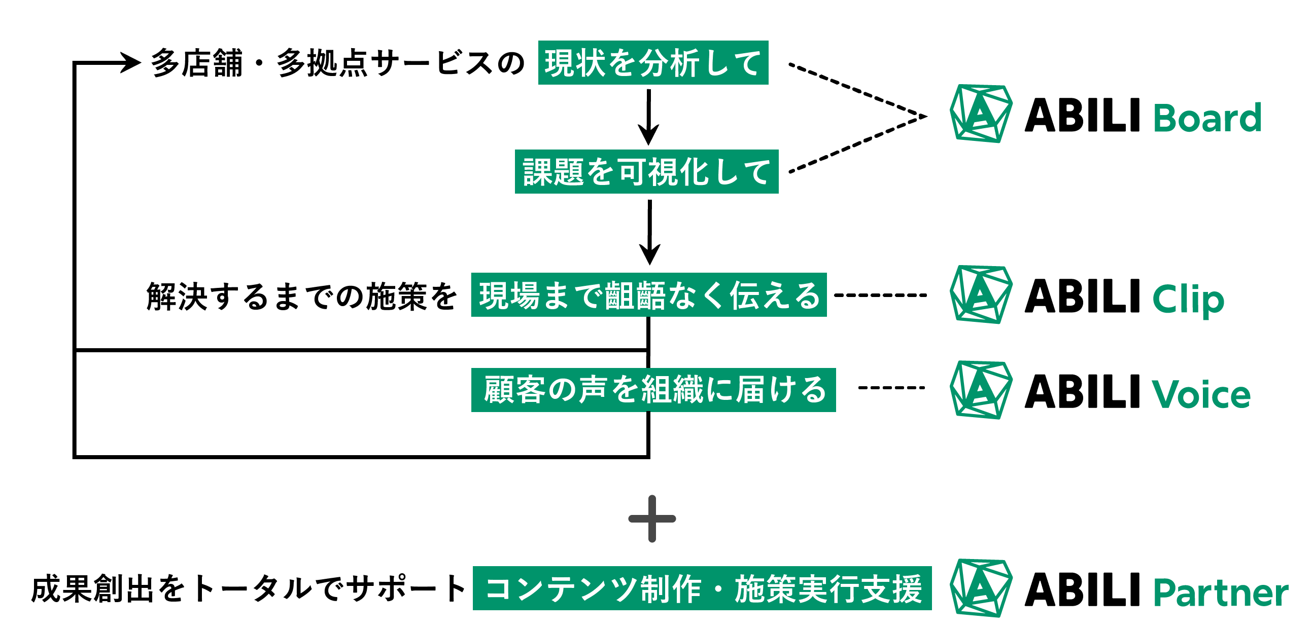 ABILIは多拠点ビジネスの状態や課題を見える化し、バラつきを改善することで提供価値と利益の最大化を推進する総合プラットフォームです。