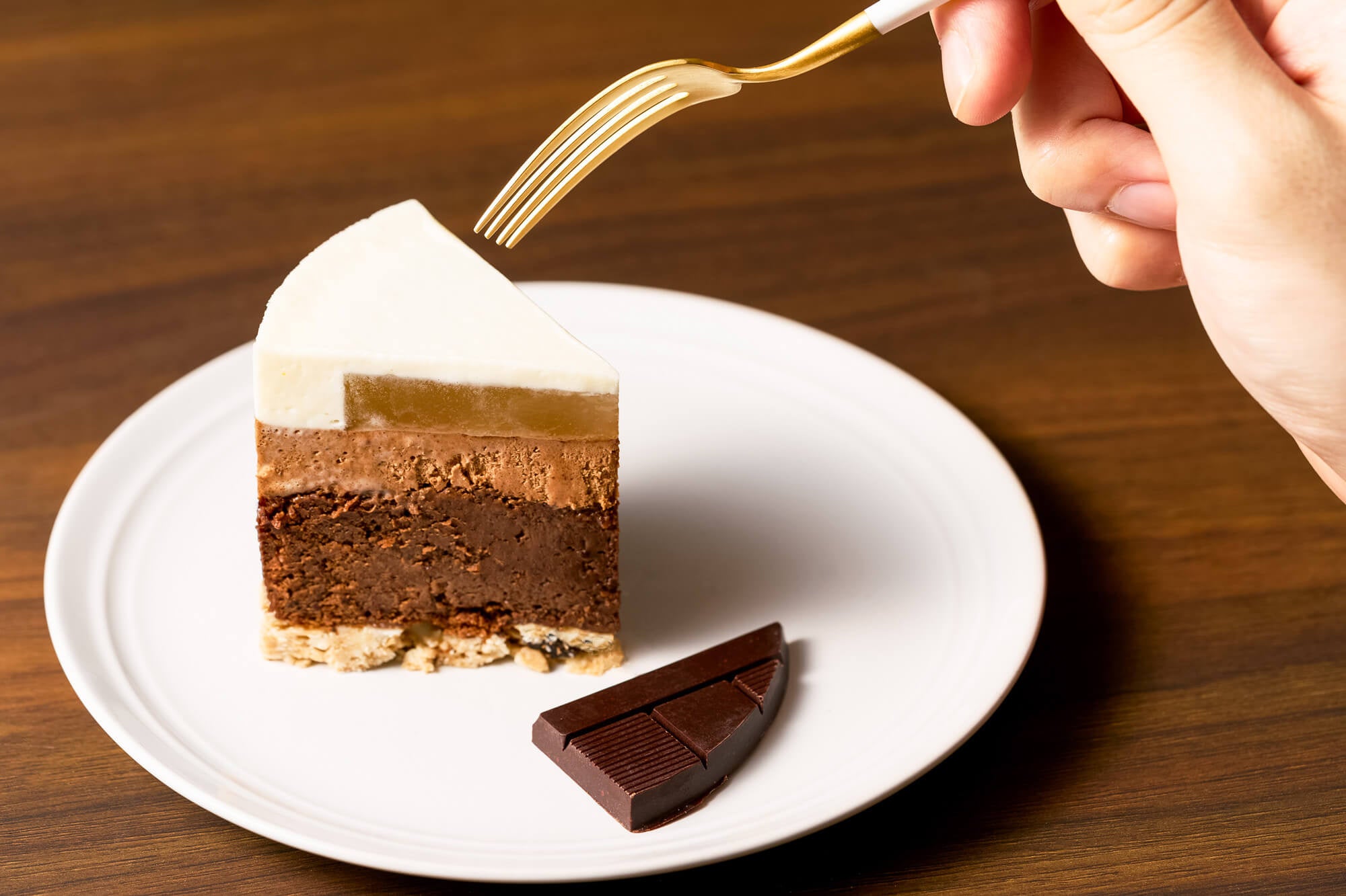 ガナッシュとムース、ジェノワーズにはそれぞれ異なるチョコレートを用いることで、濃厚なチョコレートの風味の奥に、植物や花のようなカカオ由来のフローラルな風味を感じていただけるよう仕上げました。