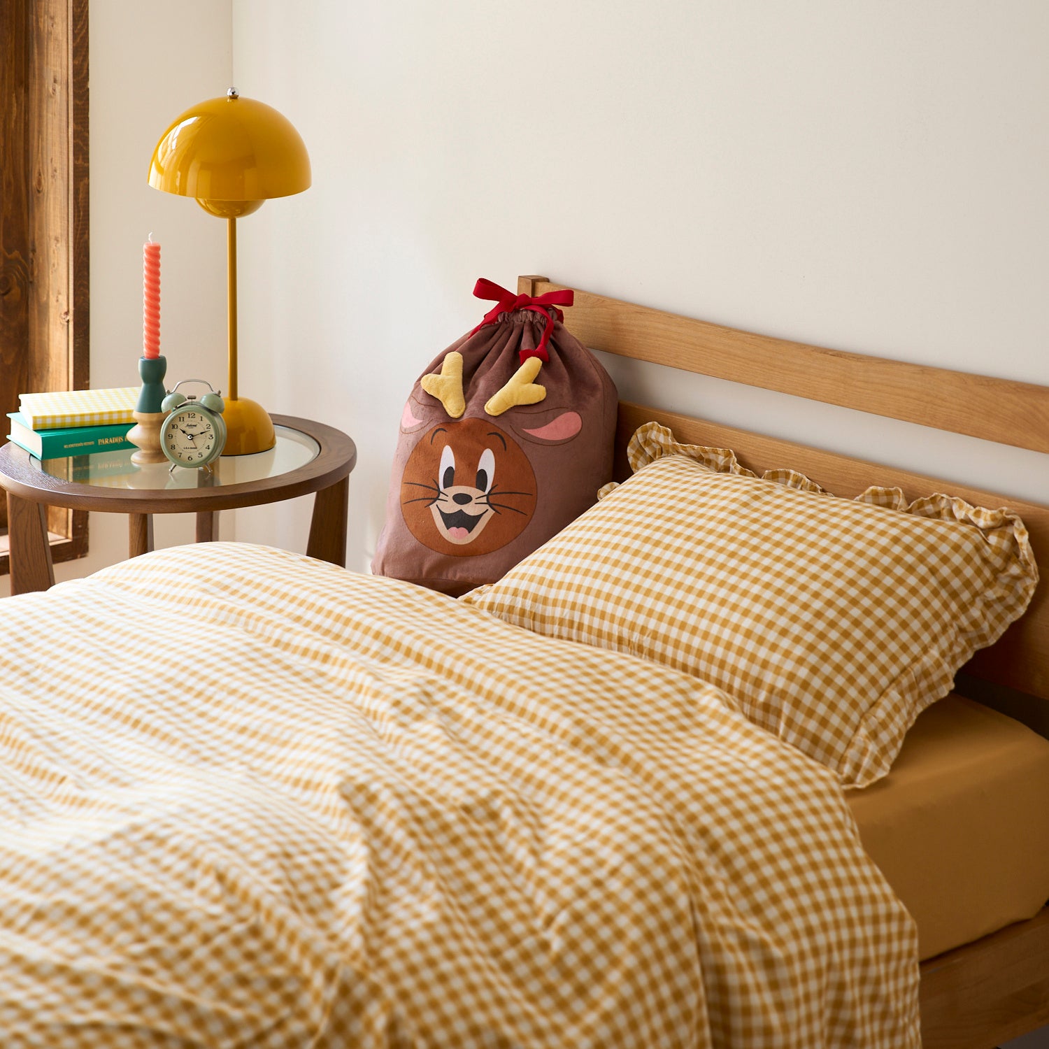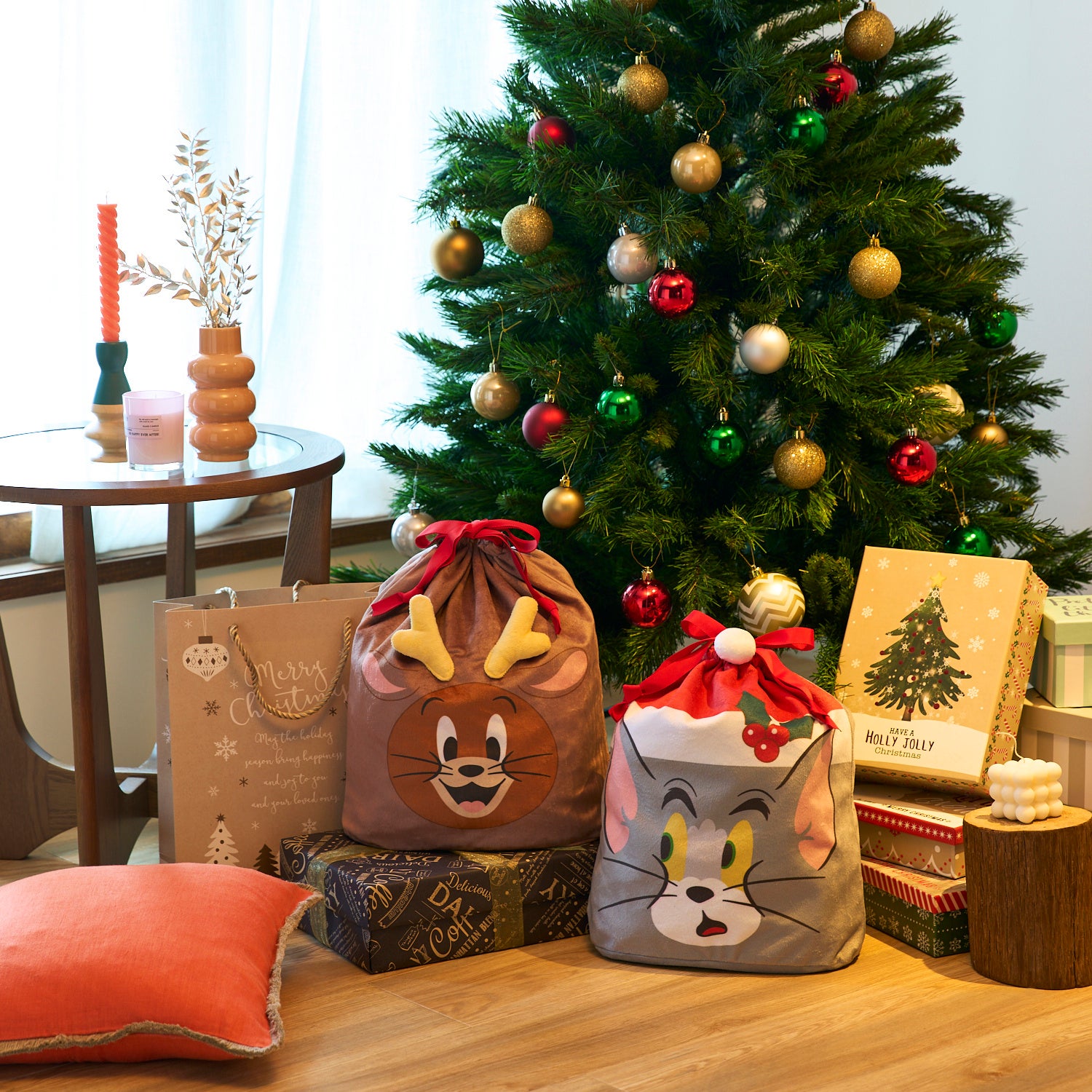 『壁掛けクリスマスツリー&オーナメントセット「スヌーピー」』は、サンタクロースやトナカイに扮したスヌーピーたちのオリジナルオーナメントがツリーセットです。置き場所に困らない壁掛け仕様なので、リビングや玄関の棚上など、これまで置くことが難しかった奥行きの狭い場所にも吊して飾ることができます。小さいお子様やペットがいるご家庭にもおすすめです。『クリスマス仕様のプリント巾着袋「トムとジェリー」』は、サンタ姿のトムと、トナカイ姿のジェリーの顔が前面にプリントされた注目のクリスマスアイテム。巾着の紐を結んで、特別なプレゼントの包装にしたり、クリスマスツリーのそばや枕元に飾ってもクリスマスムードが楽しめます。トムとジェリーと一緒に季節のイベントを楽しめる、ユニークな新商品です。