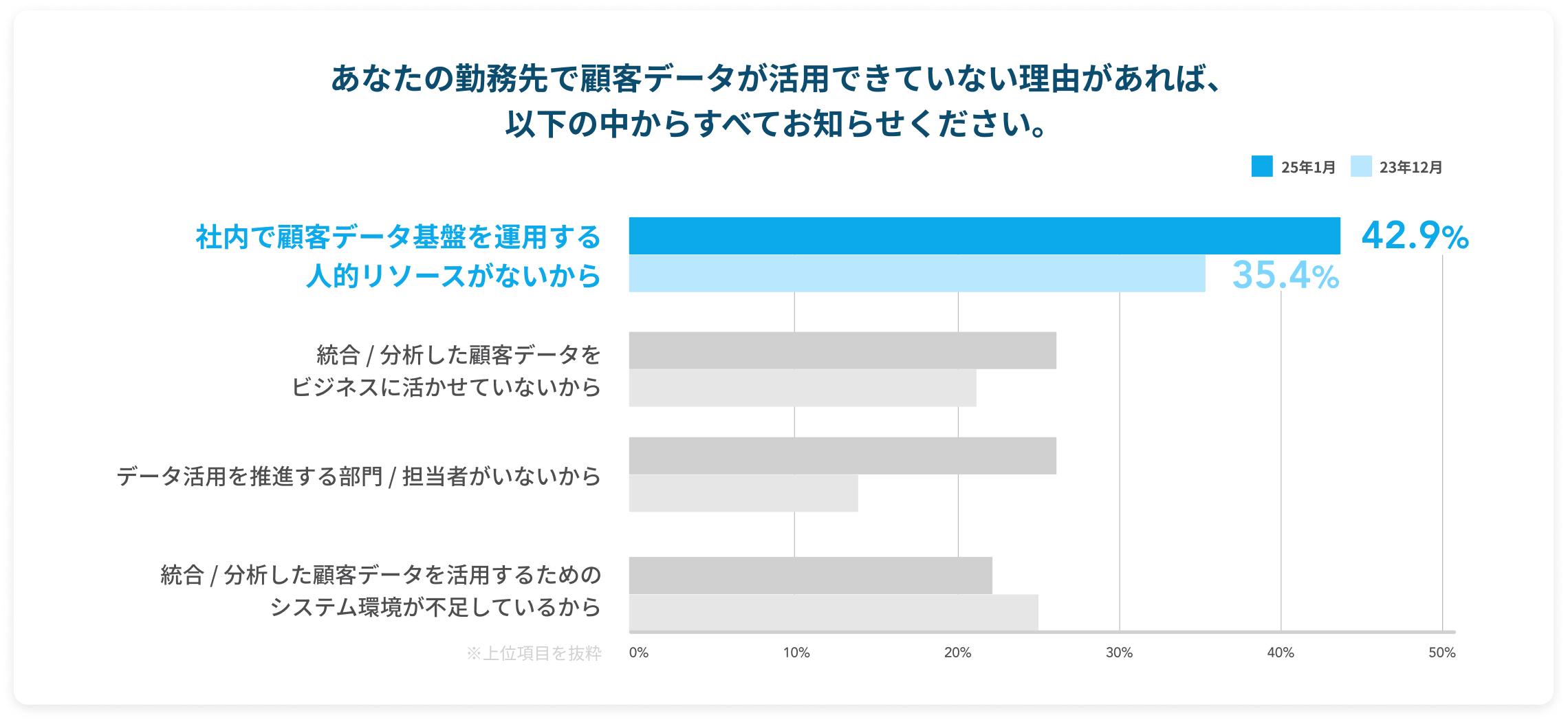 現在、マーケティング施策の高度化が進む一方で、多くの企業において、戦略を形にするための「データ設計/構築」や、施策を継続するための「運用実務」を自社で完結させることが困難になっています。最新の動向調査(※1)によると、データ活用が進まない最大の理由はツールの機能不足ではなく、「社内で運用する人的リソースが足りない(42.9%)」ことであり、戦略を描けたとしても、それをシステムへ実装し、PDCAを回し続けるための「専門性」と「リソース」の両面で、多くの企業が限界を感じている実態があります。