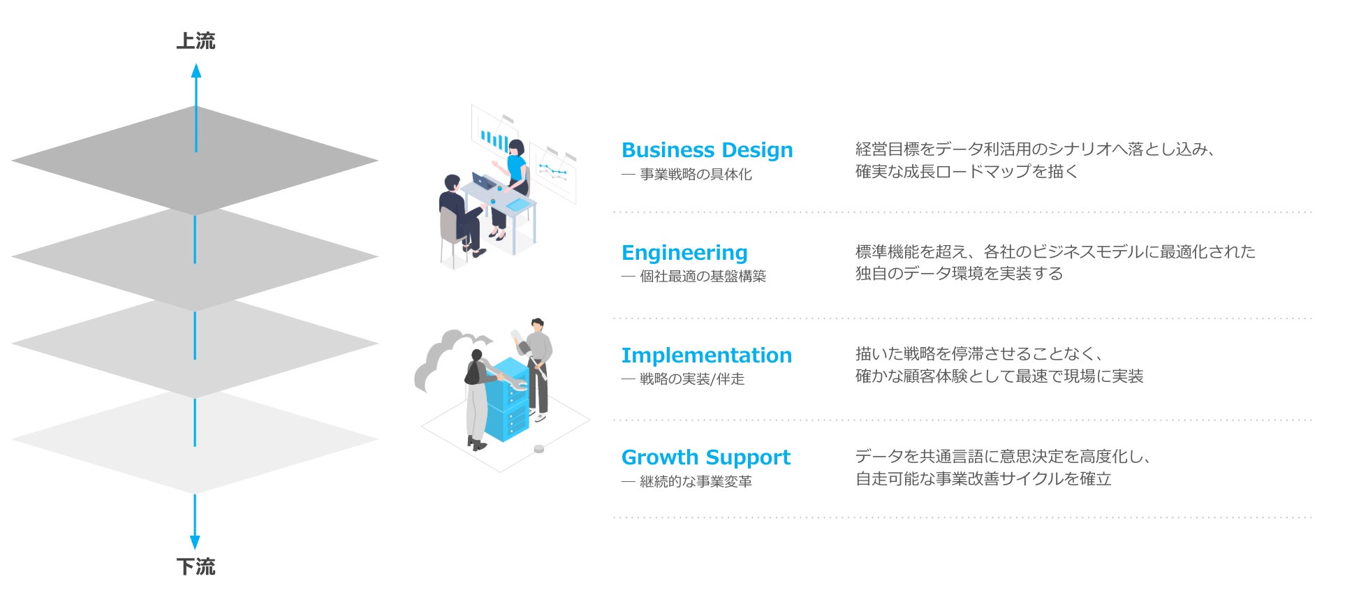 そこで、使いやすいプロダクトの提供に加え、上流の戦略立案から、専門的なデータ設計/構築、そして下流の実務実行までをトータルで支援する体制を構築しました。これにより、一貫性のあるデータ利活用を実現し、顧客のビジネス成長を加速させます。