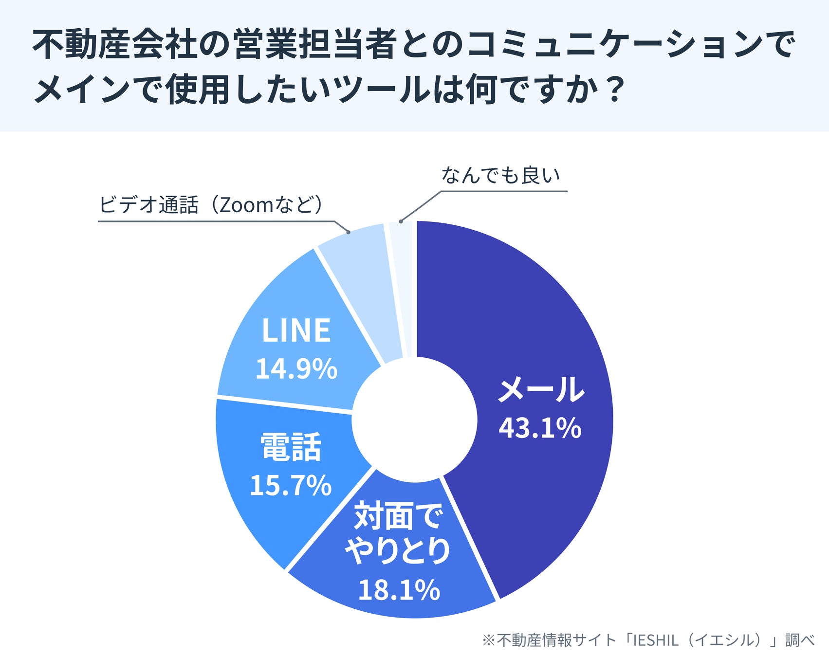不動産売買において、営業担当者とのコミュニケーションツールは「メール」が主力である一方で、伝統的手段である「電話」や「対面」は比較的敬遠される傾向にあります。