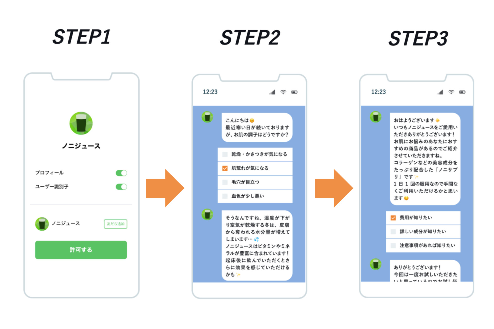 新規購入ユーザーをシームレスにLINEへ誘導し、コミュニケーションを通じてブランド期待値を把握しながら、パーソナライズされた情報を定期的に配信することで、ブランド体験を高め LTV(Life Time Value)を向上させるサービスです。