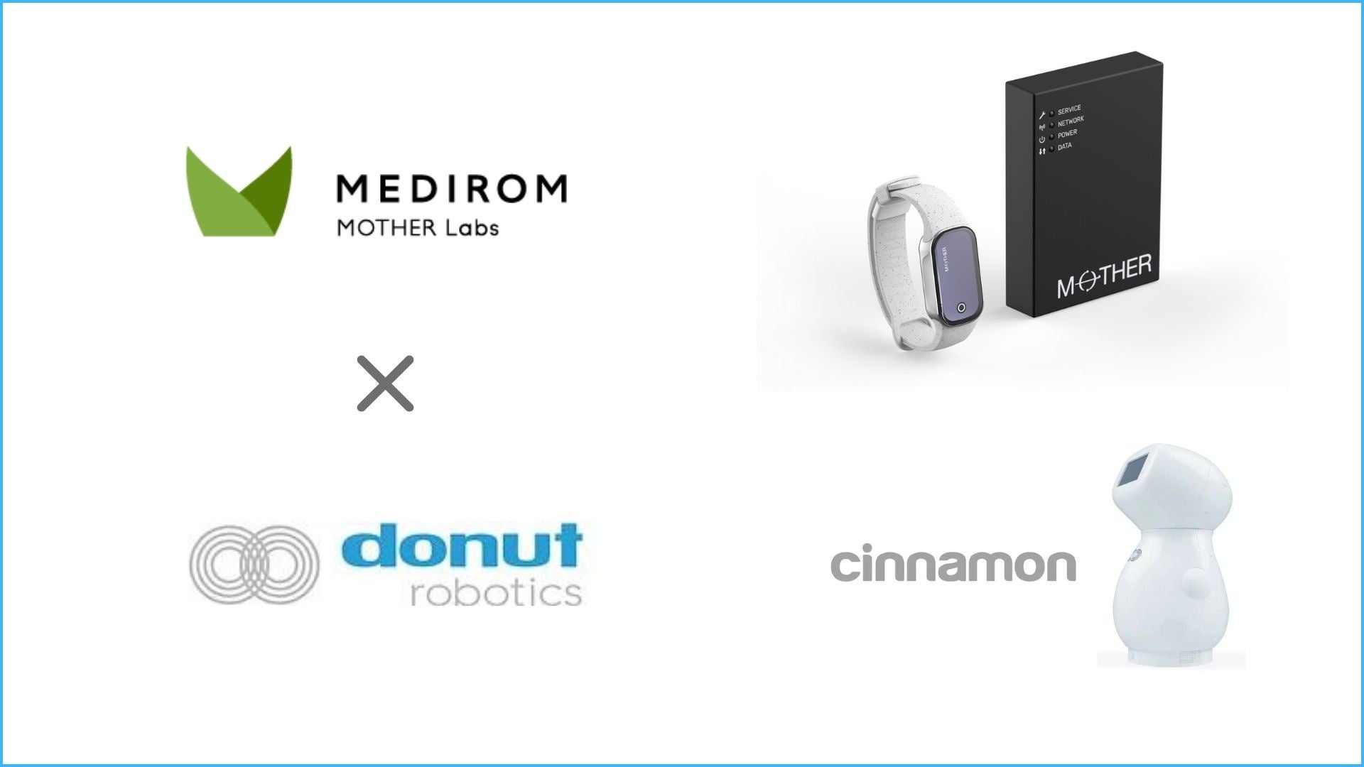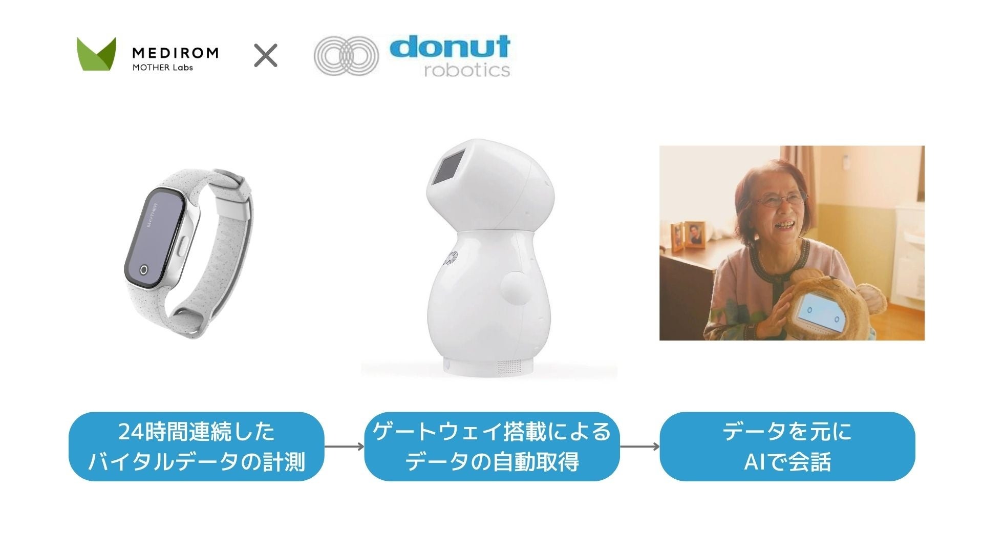 ドーナッツロボティクスは見守りロボット「cinnamon」を開発し、chat GPTを⾼齢者向けにチューニングして搭載する事を目指しています。「cinnamon」は、羽田空港ロボットプロジェクトに採択されており、羽田空港では主に外国人の接客実験を行いました。マザーラボが開発した充電不要のスマートトラッカー「MOTHER Bracelet®︎」(以下「MOTHER」)が取得したバイタルデータを高齢者向けにチューニングされたchat GPTと連携させることで異常を検知した際の本人に対する声がけやバイタルデータに応じた会話などの多くの可能性を提供できると確信し、この度「事業提携に関する基本合意書」の合意に至りました。