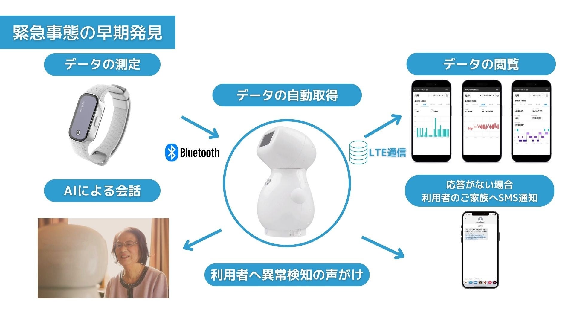 「MOTHER」が計測したバイタルデータの異常を元に見守りロボットが利用者へ問いかけを行い、応答がない場合は離れて暮らす家族にSMSで通知を送信いたします。ご家族は「cinnamon」に搭載されているカメラにより、遠方でも状況を確認することが可能になる未来の実現を目指していきます。また、「MOTHER」の「転倒検知 機能」で高齢者の転倒を検知した場合、即 通報できるよう開発も進めてまいります。バイタルデータと連動したAI会話機能付き見守りロボットの実現により現在の社会問題である独居の高齢者の見守り問題を解決することが期待されます。