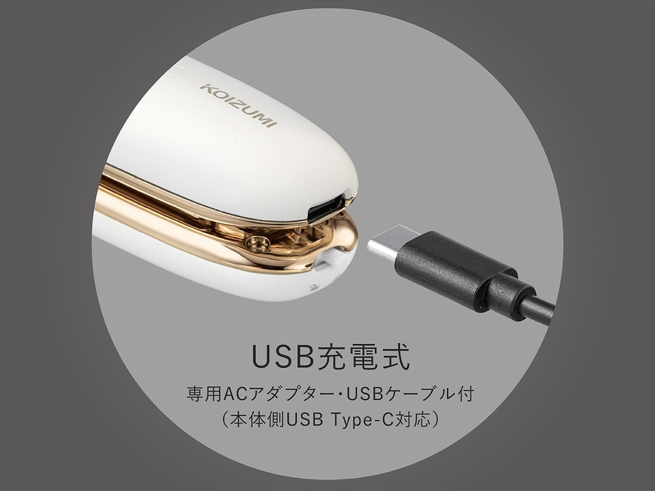 ・USB充電式で外出先でも使いやすい。専用アダプター・USBケーブル付(本体側USB Type-C対応)