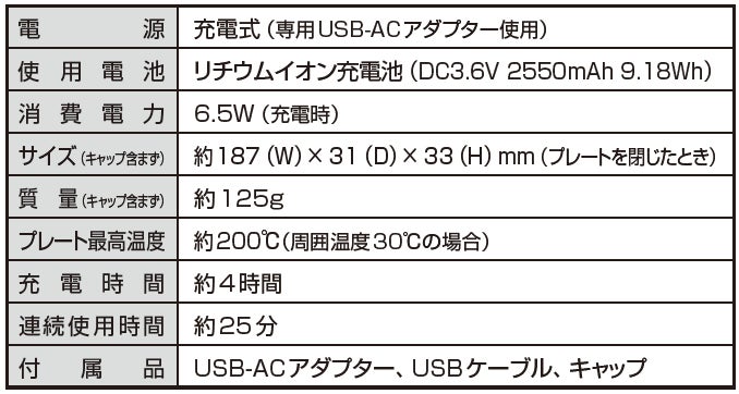 ・最高温度約200℃。2段階温度調節(約160/200℃)ができる。※周囲温度30℃の場合