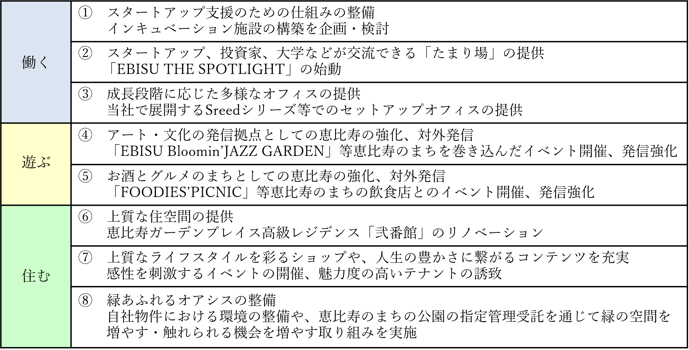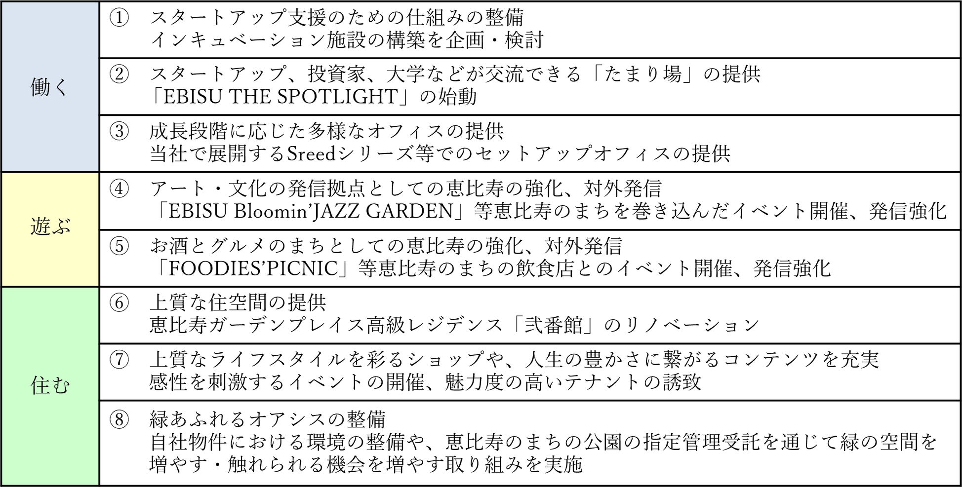 当社は、ヱビスビール発祥の地を再開発し、1994年に「恵比寿ガーデンプレイス」を開業して以来、恵比寿のまちの不動産事業者として、30年以上にわたり恵比寿のまちとともに歩んできました。これからも、地域の皆様とのつながりを大切にしながら、恵比寿を「ひらめきが生まれるまち」として描き、このまちの価値向上を推進していきます。