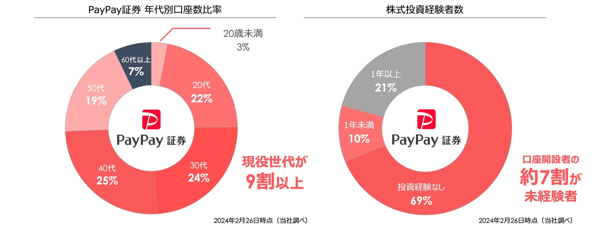 当社の顧客層としては、主に資産形成層と呼ばれる50代以下の方が9割以上を占めており、30代以下の方も約半数いらっしゃるという状況です。また、口座開設者の約7割が株式投資の未経験者といったように、資産運用初心者の方から評価いただいています(ともに2024年2月26日時点、PayPay証券調べ)。