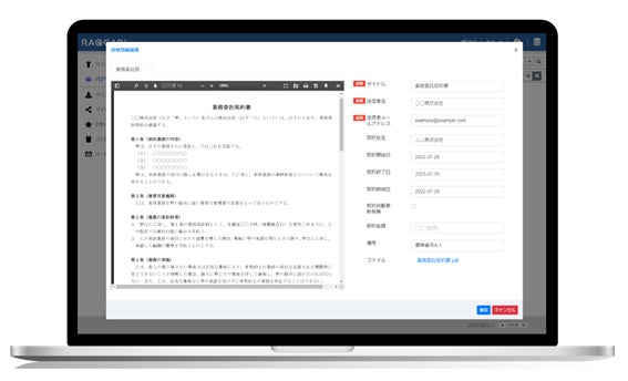 『RAQCABI』は、紙と電子が混在する契約書の一元管理を実現するクラウド型の文書管理システムです。契約書ファイルの保管や契約管理台帳の自動作成が可能で、適切な権限管理によるセキュリティを確保した上で、契約書の保管、分類、活用を実現します。