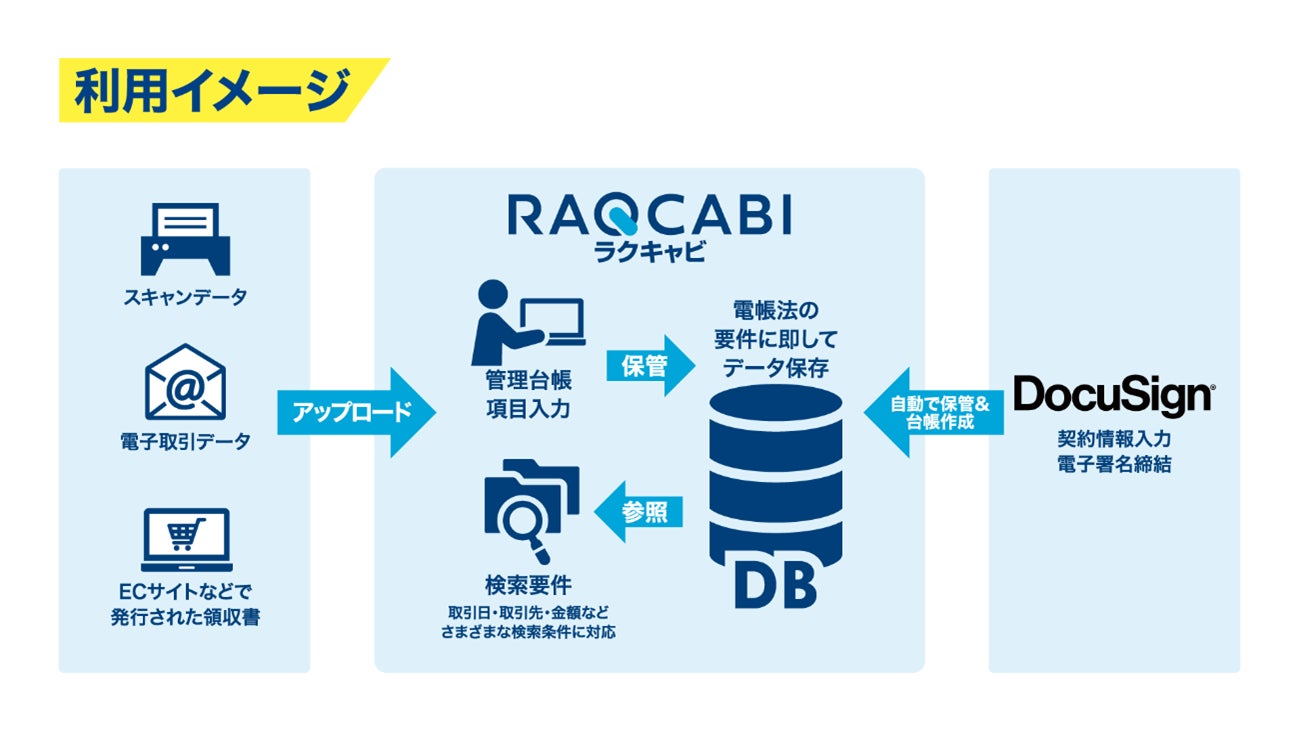 データベースは、当社グループのChatworkストレージテクノロジーズ株式会社が提供するクラウドストレージ『セキュアSAMBA』で構築しており、ドキュサイン社の電子署名サービス「DocuSign eSignature」と連携することで、締結したデータを、『RAQCABI』の管理台帳に自動で保存・検索することができます。ドキュサイン社のほか、他社の電子契約利用締結書面もインポートし、管理・閲覧・ダウンロードが可能です。また、過去の文書管理も一括でおこなうためのスキャン代行サービスもオプションで提供します。