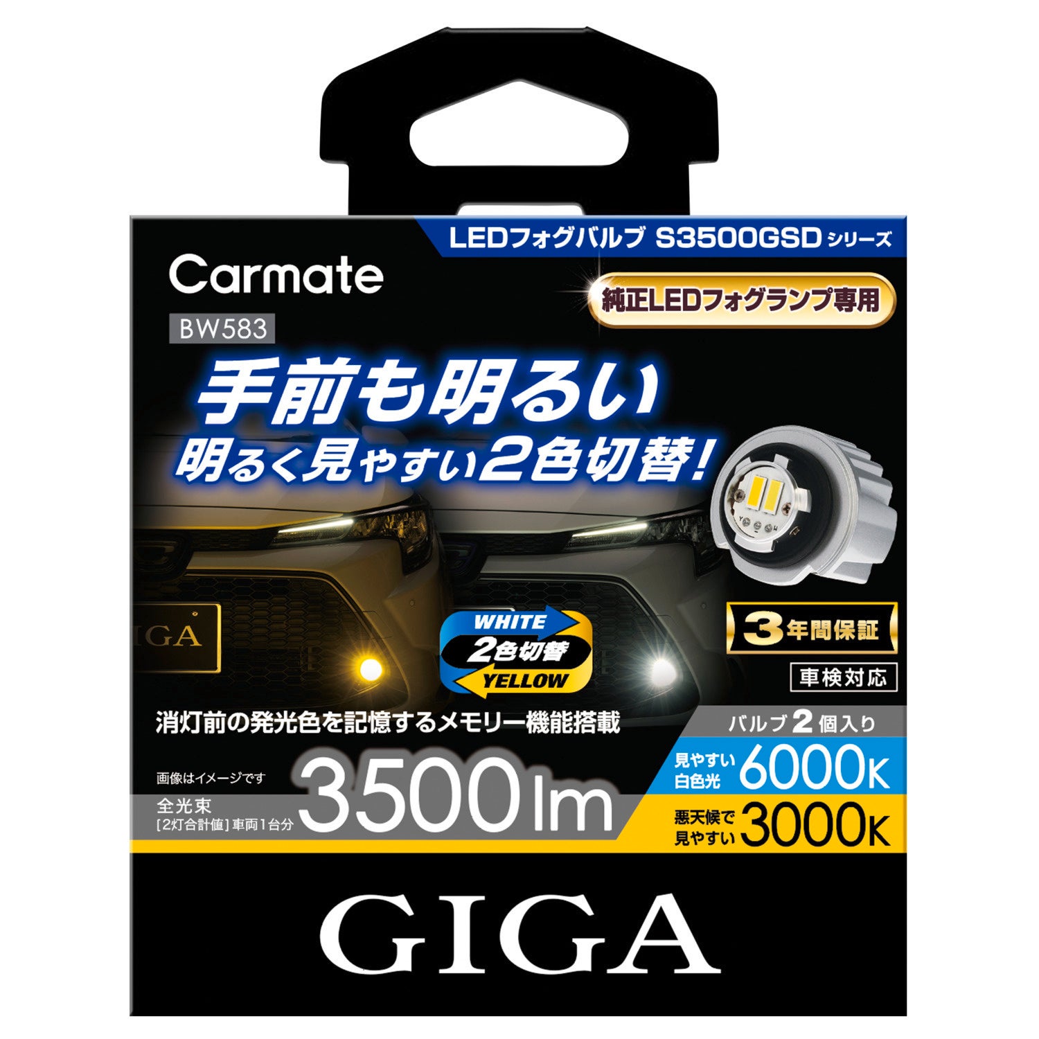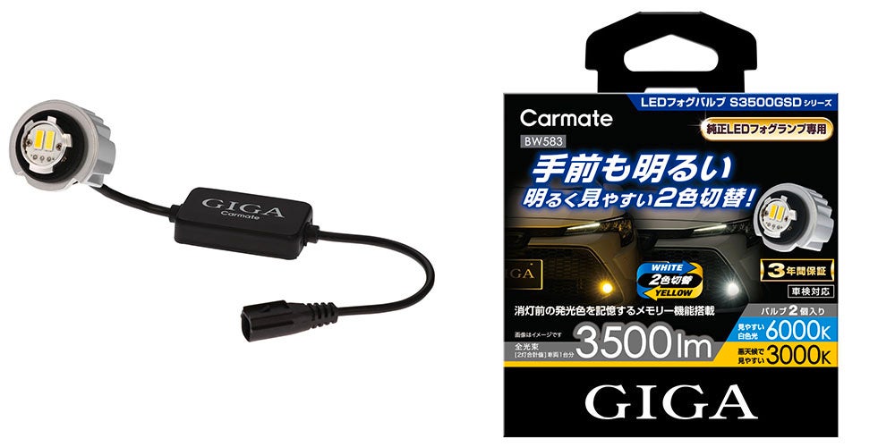 株式会社カーメイト(本社:東京都豊島区)は、自動車用ライトブランド「GIGA(ギガ)」より、純正LEDバルブから交換するLEDフォグバルブ「GIGA LEDフォグバルブ S3500GSD」を8月23日(水)に発売いたしました。白色光/黄色光の2色切り替えモデルで、バルブとドライバーユニットを別体型にすることで従来品比1.25倍※の明るさとなりました。詳細は以下をご覧ください。