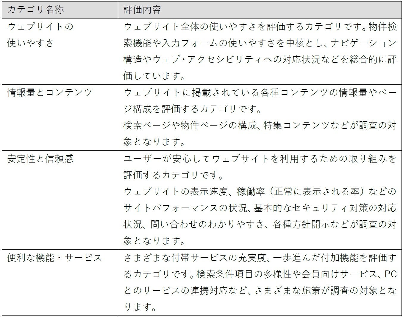 本調査では、ウェブサイトの利便性をさまざまな角度から分析・評価するために、以下の4つのカテゴリからなるランキング・スコアカードを用います。各カテゴリの主な評価内容は以下のとおりです。