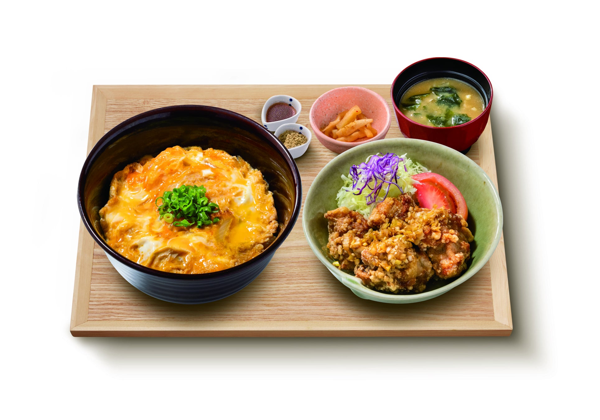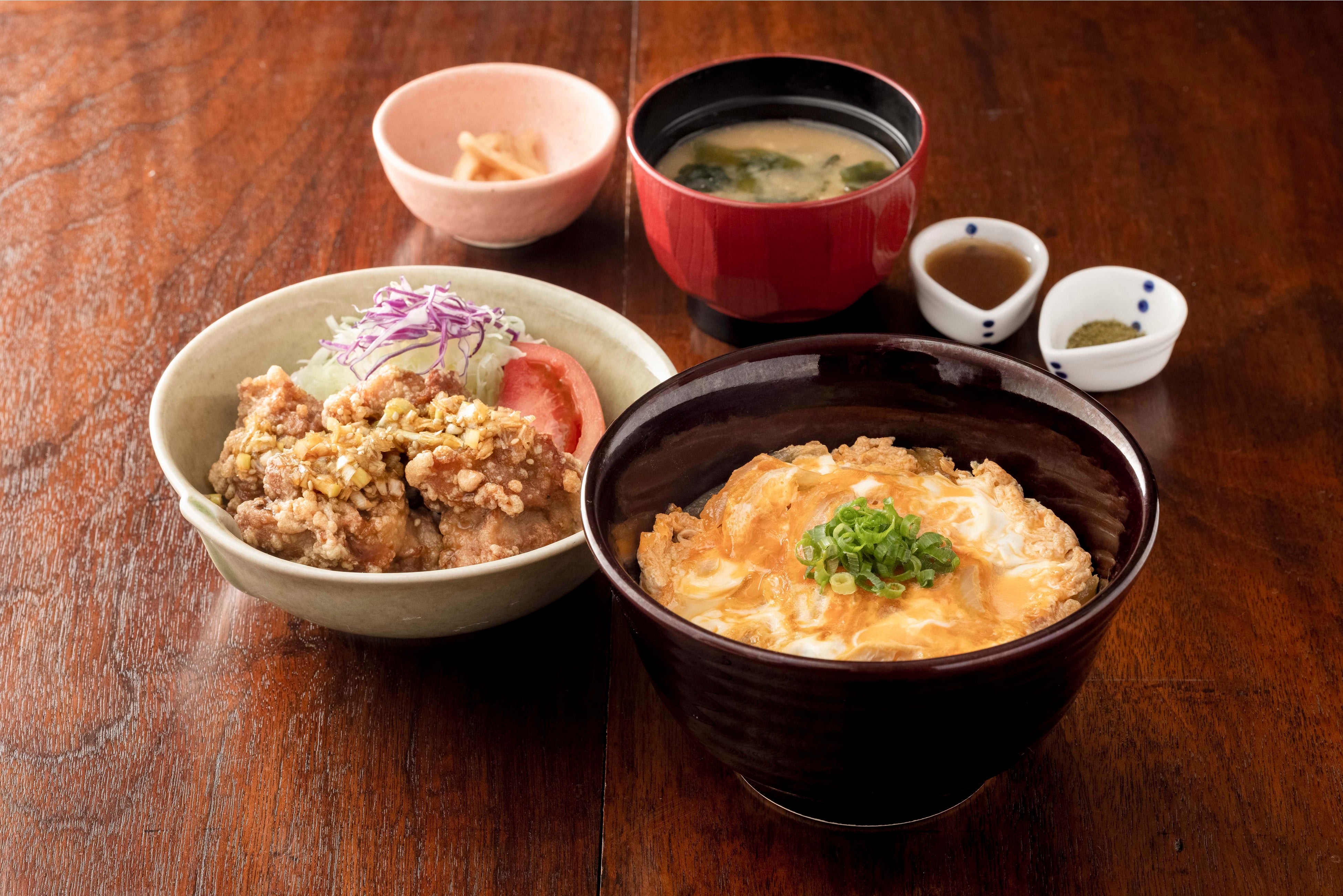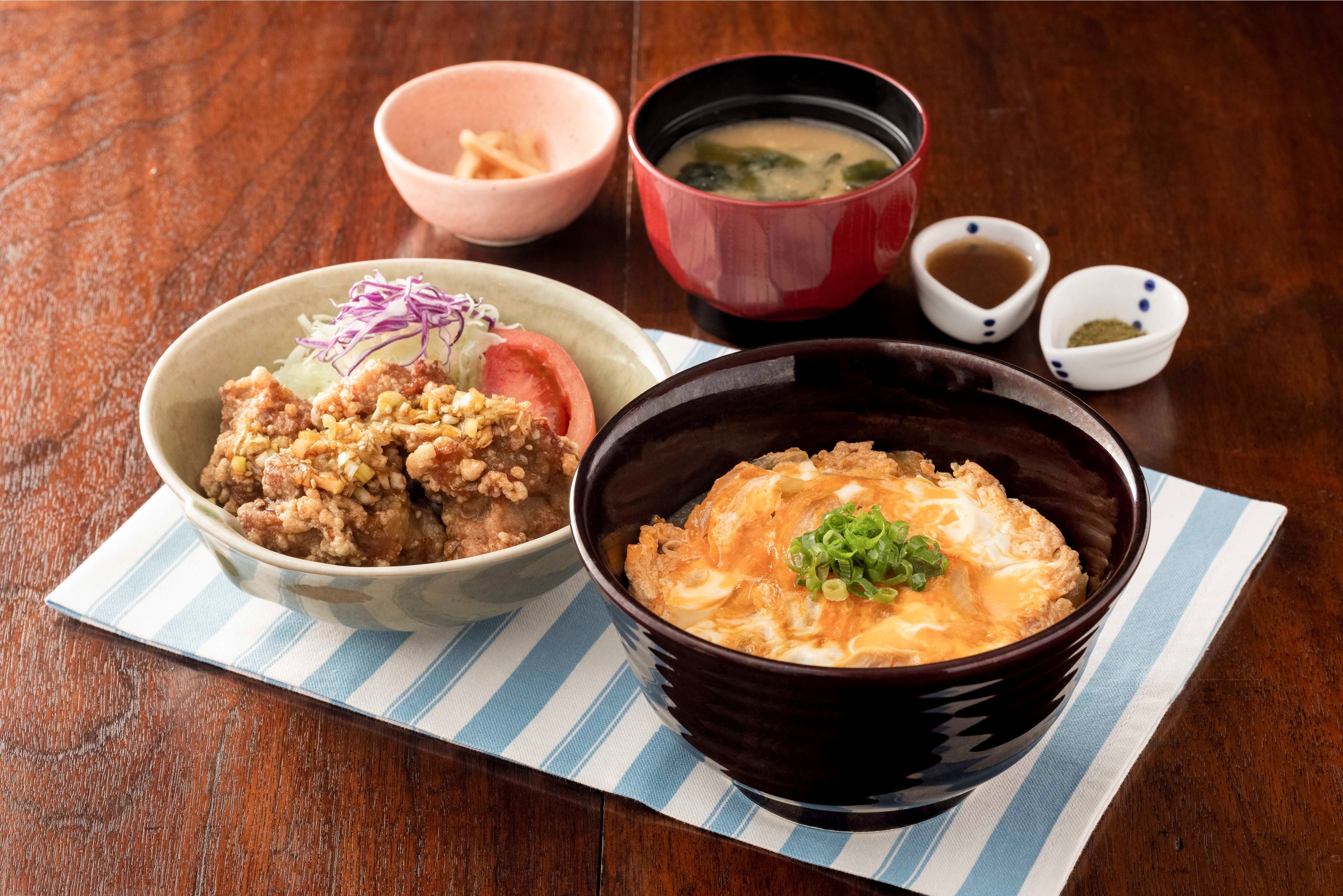 やさしい味わいの玉丼と、ジューシーな唐揚げの親子コンビ定食