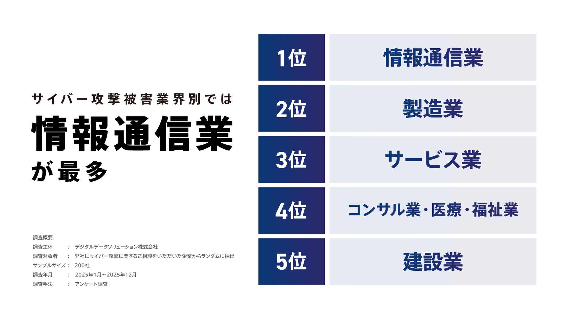 「困った人を助け、困った人を生み出さず、世界中のデータトラブルを解決します。」という理念のもと、サイバーセキュリティ、フォレンジクス、データリカバリー事業を展開するデータセキュリティカンパニー、デジタルデータソリューション株式会社(本社:東京都港区、代表取締役社長:熊谷 聖司、以下デジタルデータソリューション)は、2025年にサイバー攻撃をうけた企業200社の被害実態を調査し、2026年のセキュリティ脅威について予測を行いました。
