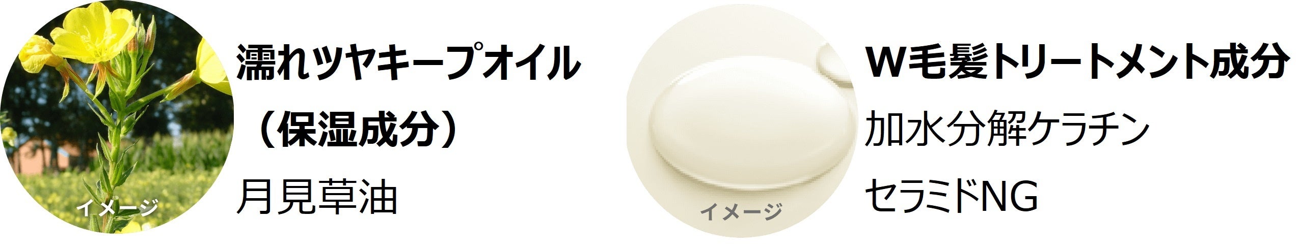 濡れツヤキープオイルとして、月見草油(保湿成分)を配合。また毛髪トリートメント成分として加水分解ケラチン、セラミドNGを配合しています。
