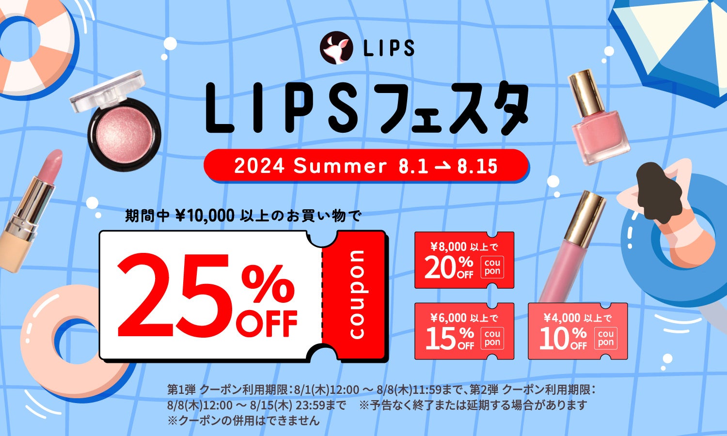 2024年8月1日(木)12:00から開始の「LIPSフェスタ 2024 Summer」では、4種類のお得なクーポンをLIPSアカウントをお持ちの方全員に配布しています。また、一部対象商品の購入ポイント還元率が大幅UPするなど、ご愛顧いただく多くの方に喜んでいただける企画をご用意。