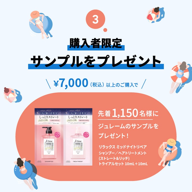『LIPSショッピング』で7,000円(税込)以上を購入いただいた方のうち、先着1,150名様に「ジュレーム」のシャンプー&トリートメントのサンプルをプレゼントします。