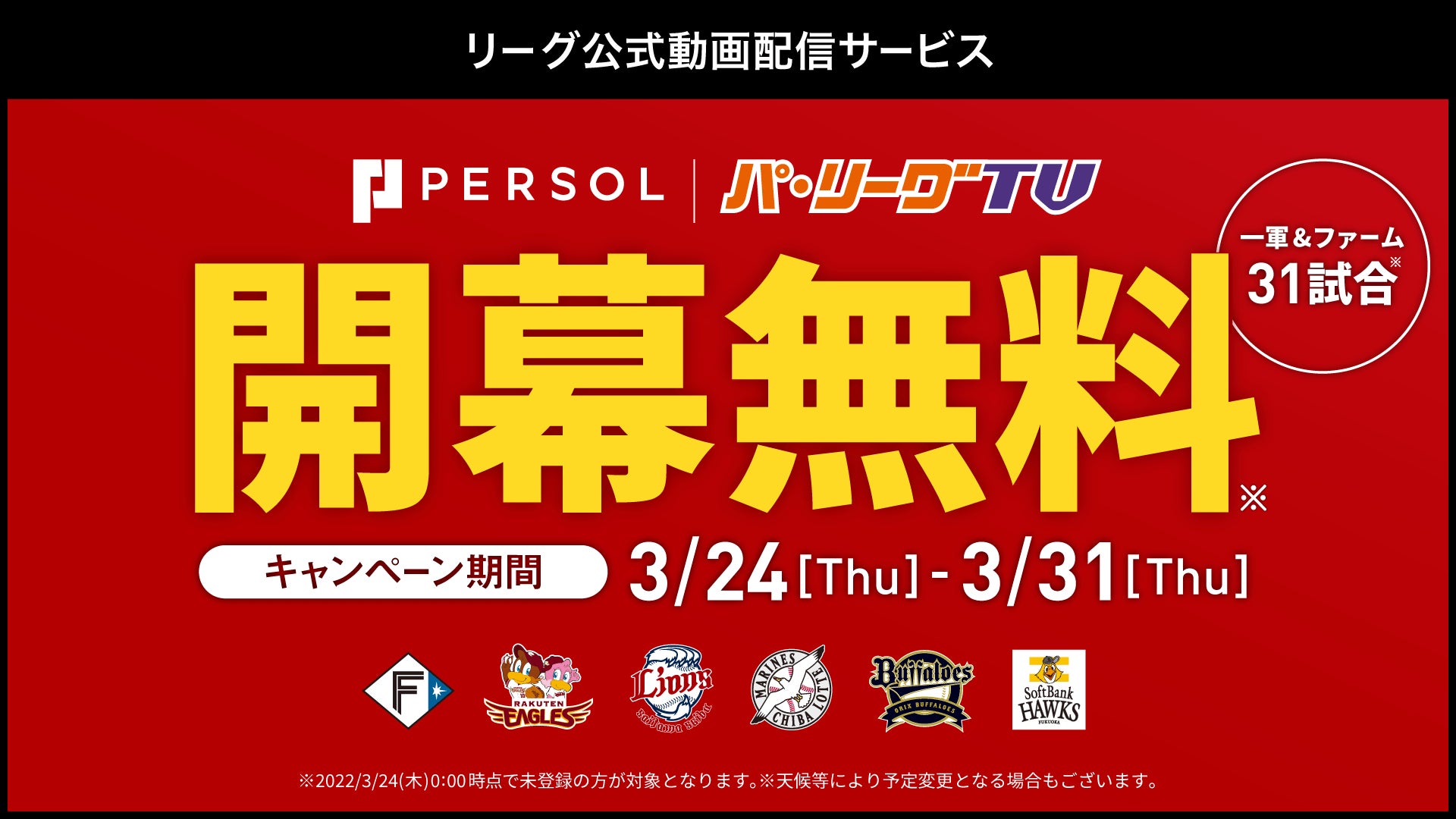 パシフィックリーグマーケティング株式会社(本社:東京都中央区、代表取締役CEO:根岸 友喜)は、リーグ公式動画配信サービス「パーソル パ・リーグTV」で、2022年3月24日(木)から3月31日(木)の期間において、全ての有料サービスを無料でご利用いただける開幕無料キャンペーンを実施することをご案内いたします。