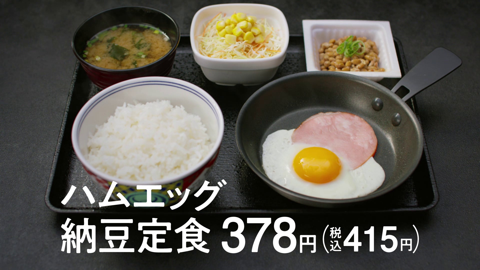 吉野家は1982年に朝定食の販売を開始しました。今年で40周年となるできたてあたたかな朝定食は、TV CMにも登場する「ハムエッグ納豆定食」378円(税込415円)はじめ種類が豊富です。
