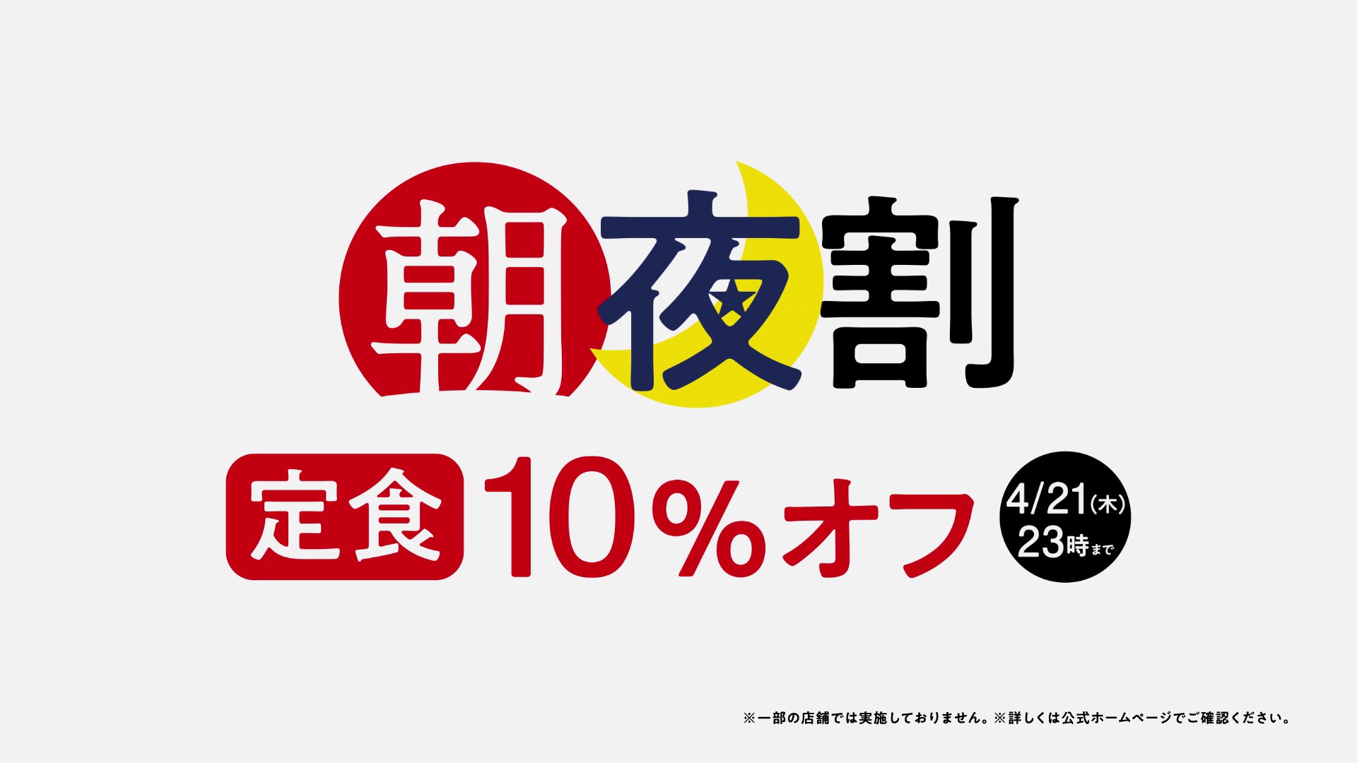 4月5日(火)から4月21日(木)の合計16日間は全国の吉野家店舗※で吉野家の「定食」全品を税込価格から10%割引して提供する『朝夜割』を実施します。『朝夜割』の実施時間帯は4時から11時と17時から23時となります。この機会に是非、吉野家の「定食」をお楽しみください。定食のご飯は24時間増量・おかわり無料です。※一部店舗を除く