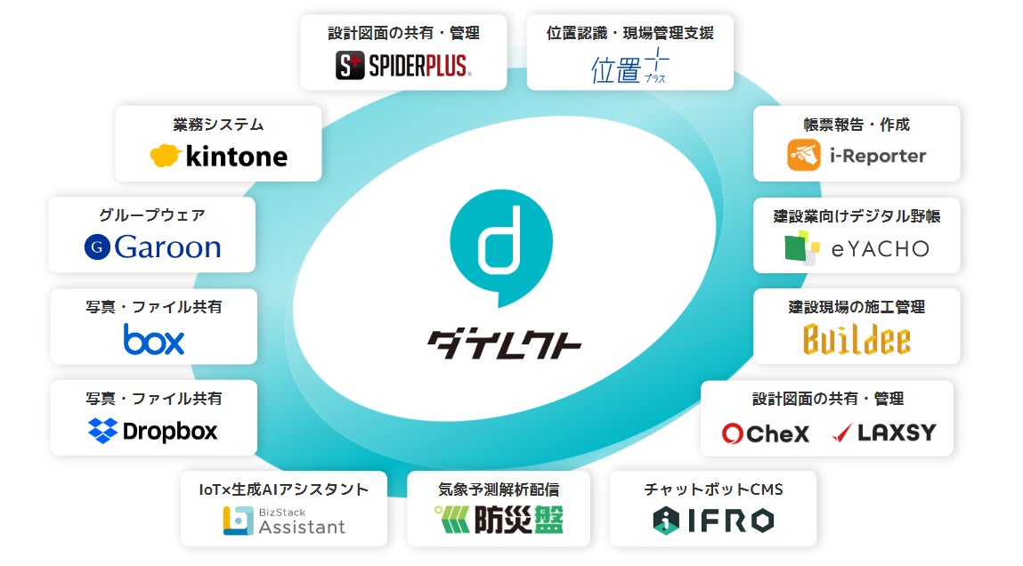 「direct」は2019年より他社サービスと積極的な連携を行っております。特に現場で活用されている『kintone』や『BOX』『Dropbox』など、様々なSaasサービスや、建設業で幅広く支持されている図面アプリ『SPIDERPLUS』、『CheX』および『LAXSY』、建設現場施工管理サービス『Buildee』などお客さまの声を聞きながら連携パートナーを拡げてまいりました。