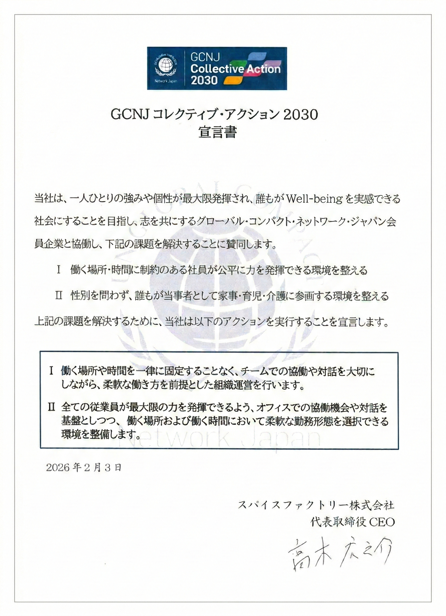 デジタル・トランスフォーメーションを⽀援するスパイスファクトリー株式会社(本社:東京都港区、代表取締役CEO:高木 広之介)は、一般社団法人グローバル・コンパクト・ネットワーク・ジャパン(GCNJ) が推進する「GCNJ コレクティブ・アクション 2030 公平な働き方」に賛同し、自社の課題解決アクションを宣言。宣言書に署名しました。